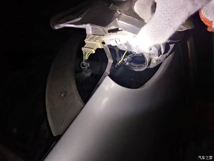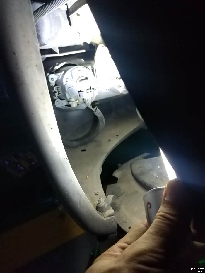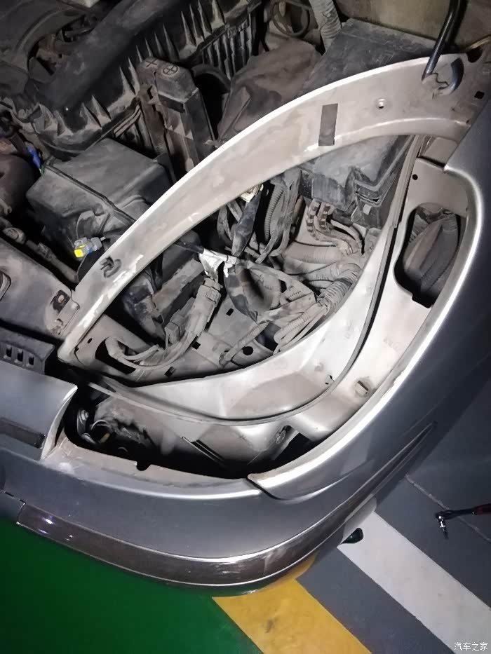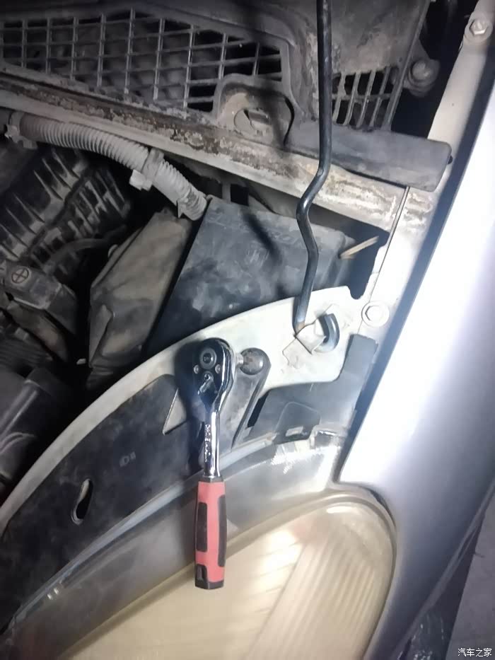 拆上面2个螺丝,把轮胎转一边,把轮胎内衬板掀开一点,把里面的螺丝旋松就可以拿出大灯总成