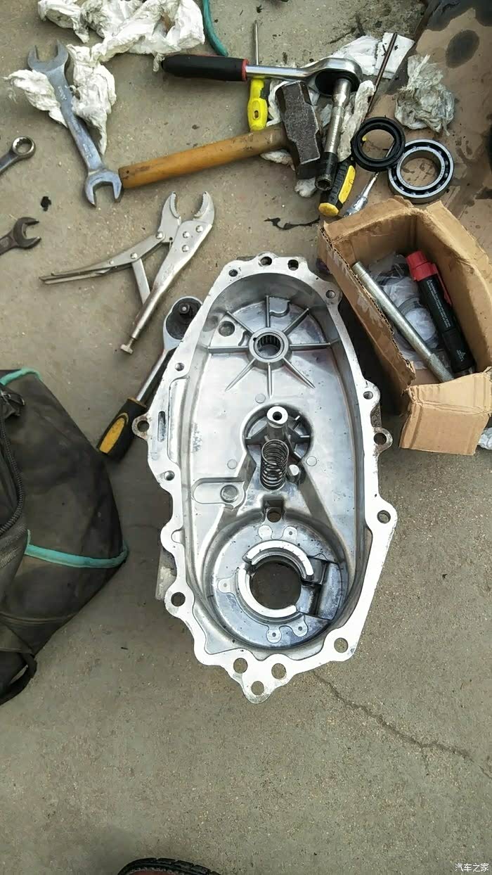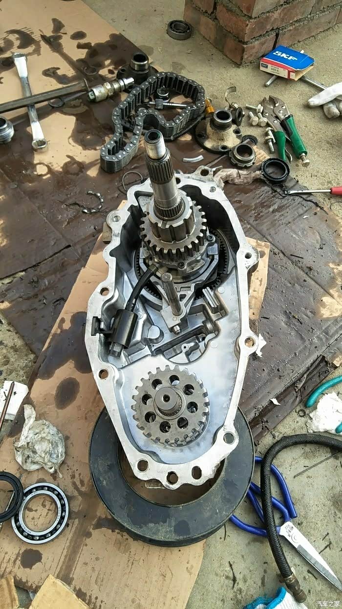 前段时间分动箱后输出轴油封漏油,换了后前两天又发现漏油。又买了一个油封,找了个修车店准备换上,拆后传动轴,拿掉法兰取出旧油封。我用手晃了一下后输出端,发现有间隙,这就不对劲了,应该没间隙才对用手钳转动四驱切换轴,居然拧不动。前天下午,找了个闲置的举升机(老板有事外出),自己整。上架子,拆下前后传动轴,落一点变速箱分动箱就能卸下来了。天快黑了,把分动箱带回家开拆。