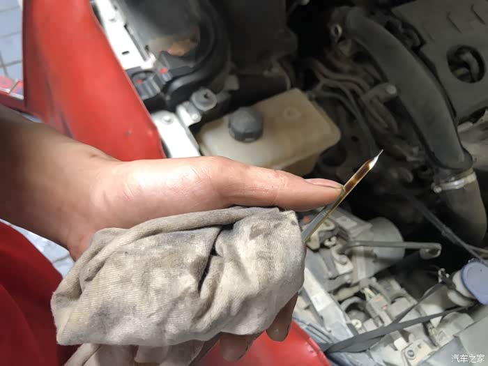 拿抹布擦干油尺。