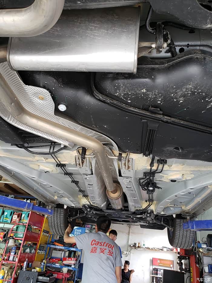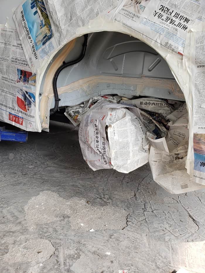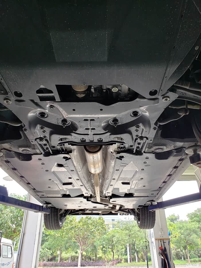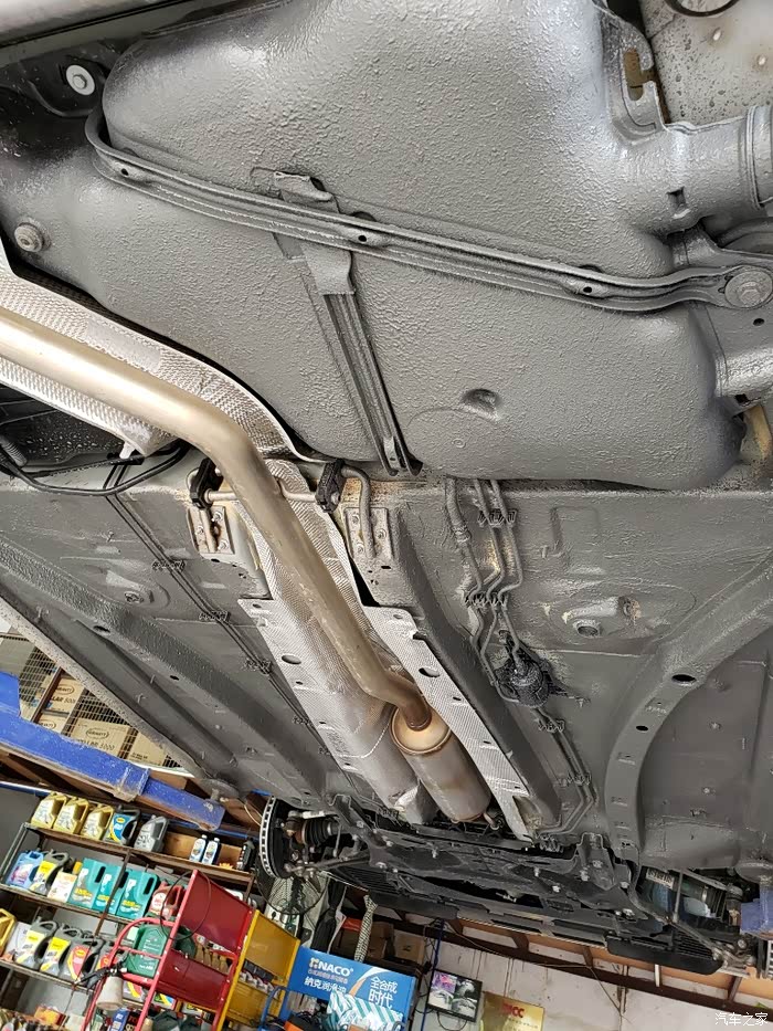 由于我的初衷就是提高隔音效果(尤其想降低轮噪),材料买的也足够多(6罐2L装),所以还是让师傅把4块底板拆掉,在车底加喷2道底盘装甲。
