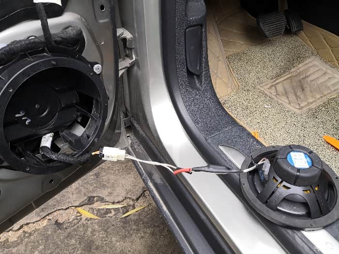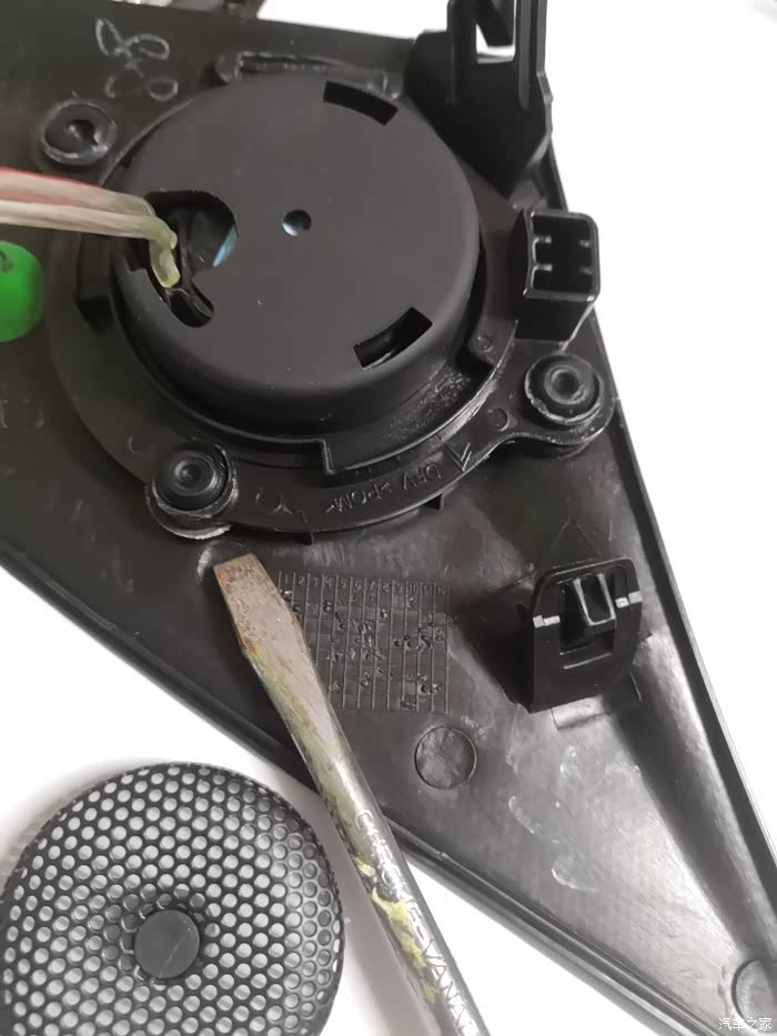 用一字螺丝刀,直接把原车的高音支架撬开,完美套入!