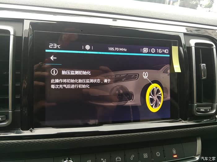 胎压监测初始化会显示轮胎黄色标记,提醒胎压不足。(小问题,屏幕上显示的是左前轮胎,我一开始也以为是左前轮胎,但事实证明,可能是四个轮胎中的任何一个,屏幕显示仅是提醒胎压存在问题而已)