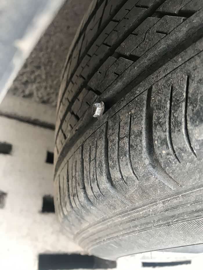 下车一看,凉凉,看样子是扎的挺深,大清早的冻死个人,看了看,气还挺硬,能挺到轮胎店,只能开到轮胎店了!