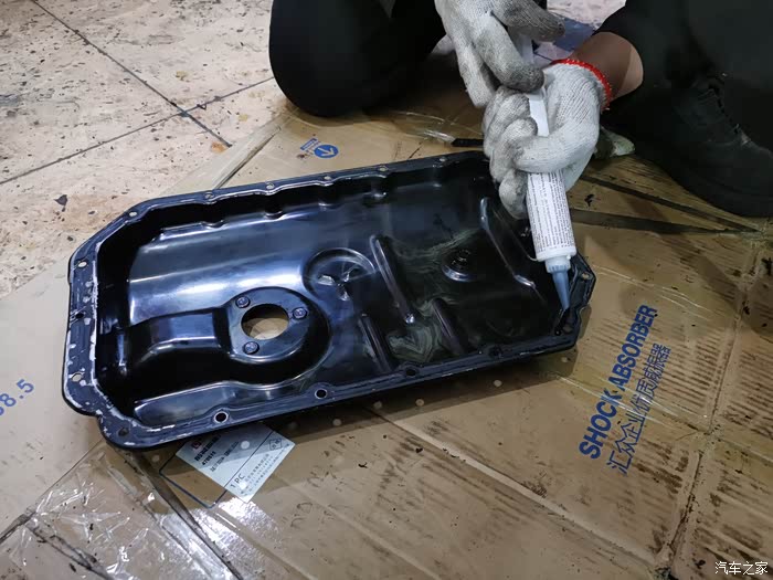 密封胶打好,清理完发动机底部,开始按照原步骤装回油底壳,中间机油散热器的固定螺丝还断了一个 ,重新把断头螺丝取出再替换,大概用了2个多小时才完全装好油底壳,又打开了两瓶超凡540加入