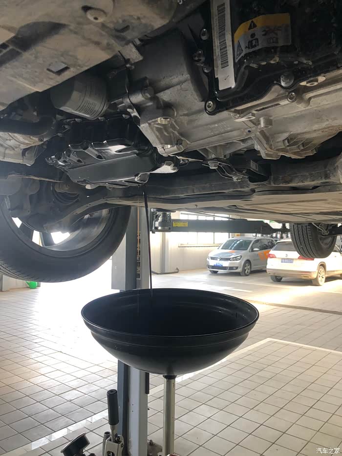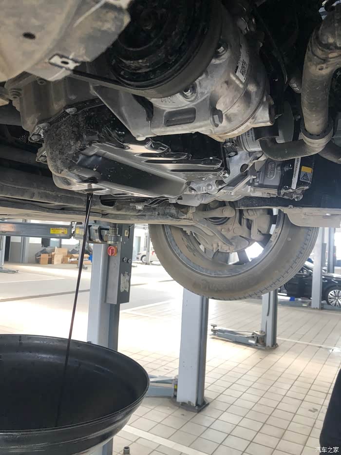 升起,师傅在检查底盘并且拆下螺丝准备放出里面的机油……