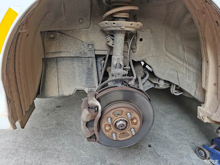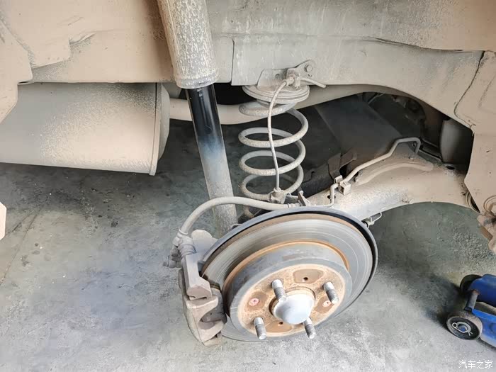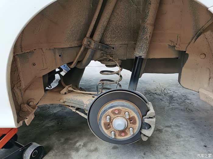 趁顶起车子,车轮全拆了。检查一下悬挂系统。减震有无漏油,各种胶套有无破损。
