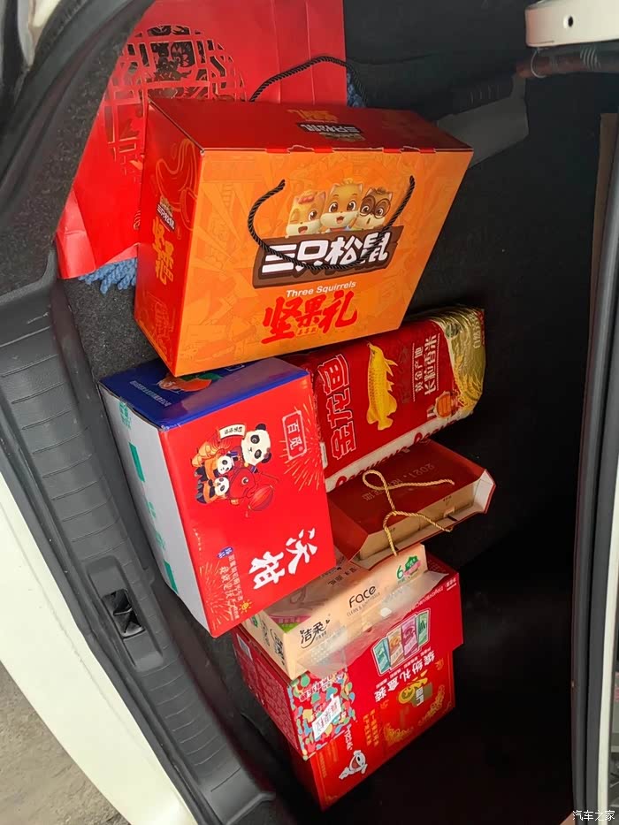 好在有相当大的后备箱,才不至于徒手搬这些重量级的礼品,不过回老家可要幸苦我家小白了,这时候后备箱最实用了,就等着放假开开心心回家了。