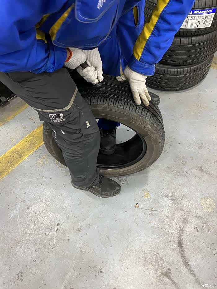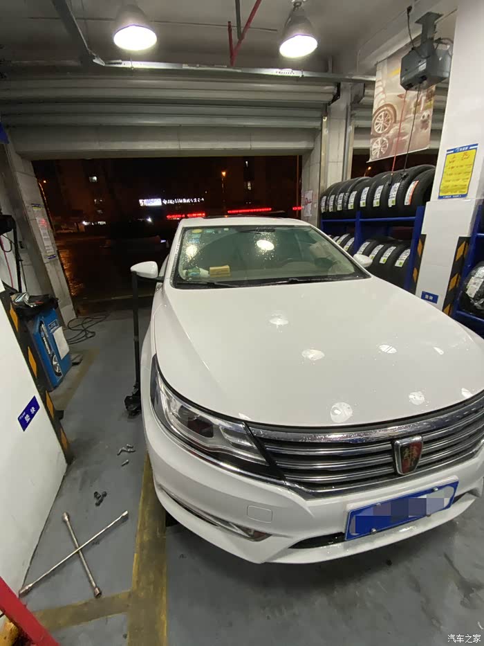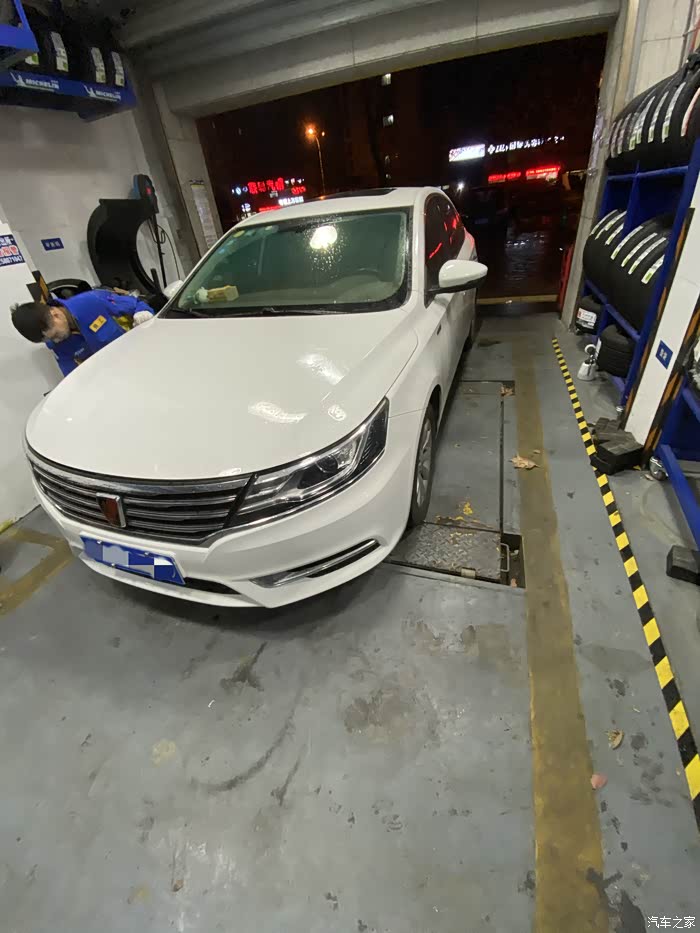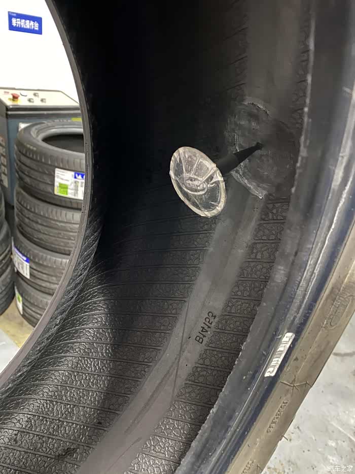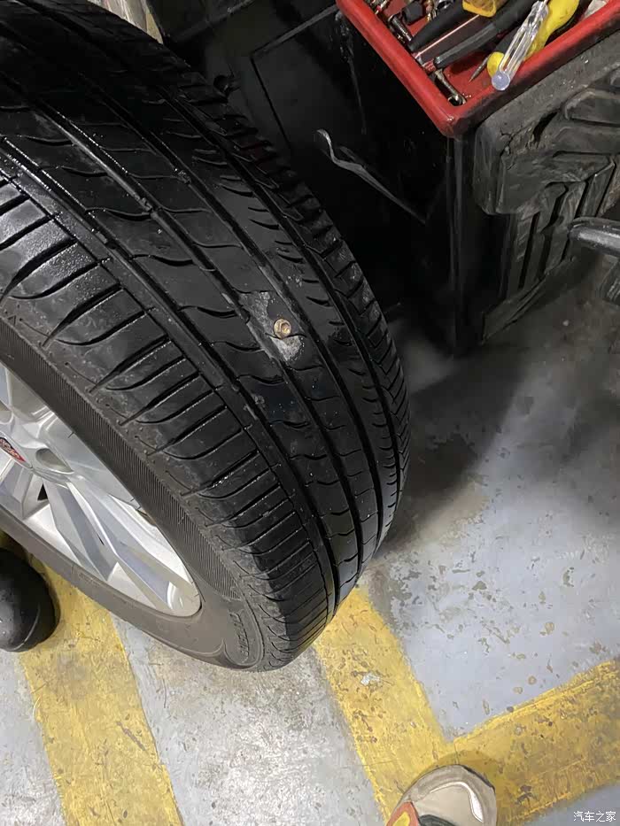 荣威小6从来也没有出过什么问题,突然早晨上班途中跳出胎压报警,因为还两公里就到公司了,就没下车查看,到公司停车场,立即查看轮胎状态,发现右前轮胎明显偏软,准备下班后前去维修。下班天已经黑了,看起来车胎里气还是听多了,除了踢上去稍微软一点,应该能撑到修车点。如果是完全没气了,就需要更换备胎再行驶了,否则一是不安全,二是完全没气的情况下行驶会伤汽车轮毂,而且原本的塑胶轮胎也不能再用了。最终百度导航去了最近的一家车享家,小师傅一眼看出了车胎有问题,立马拆下轮胎查看情况。