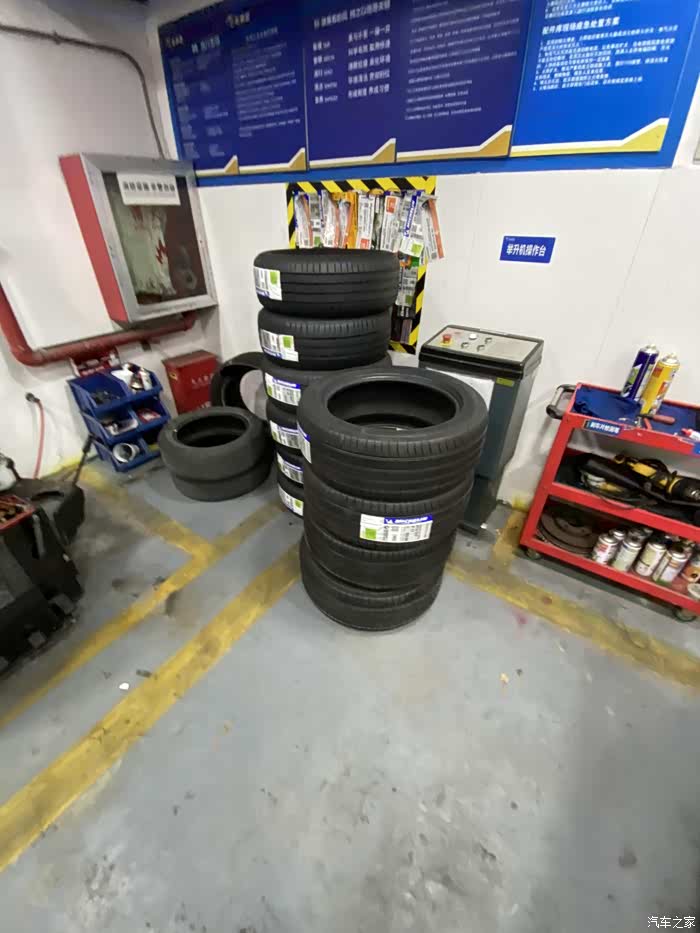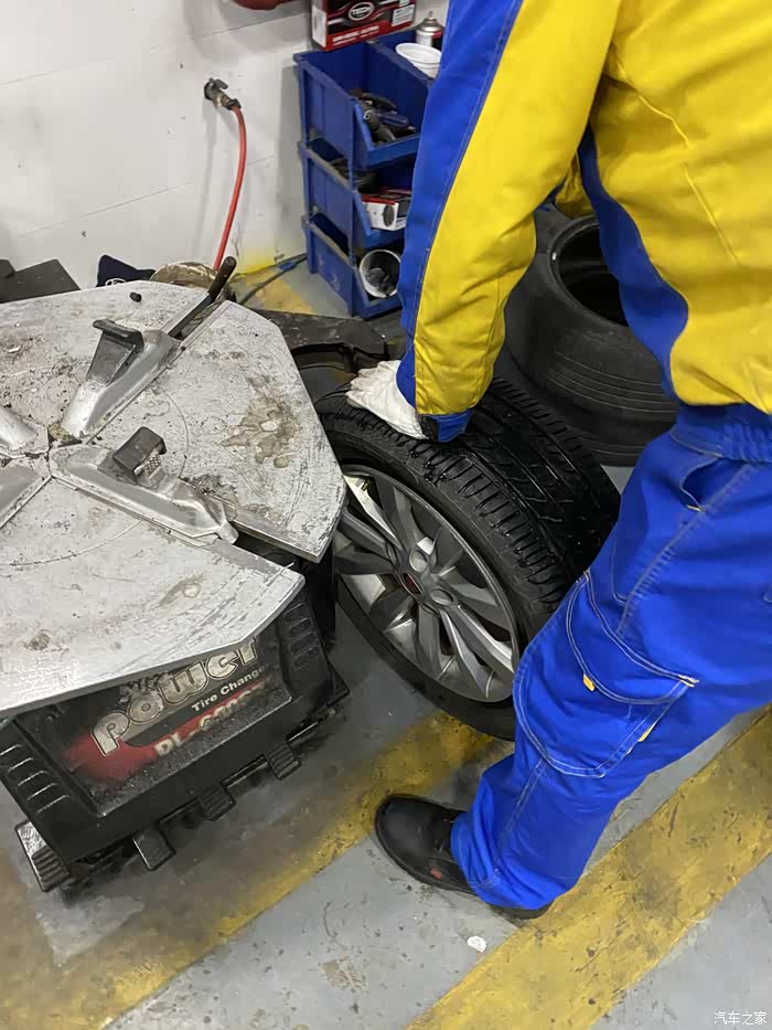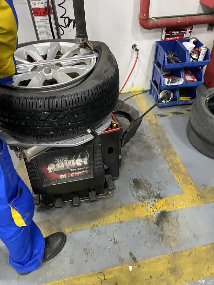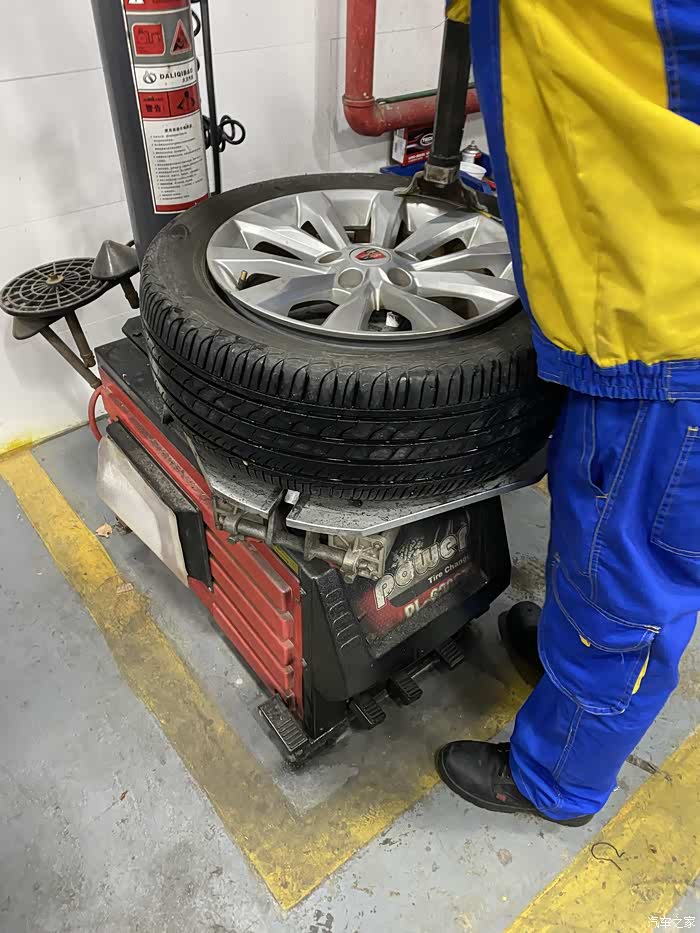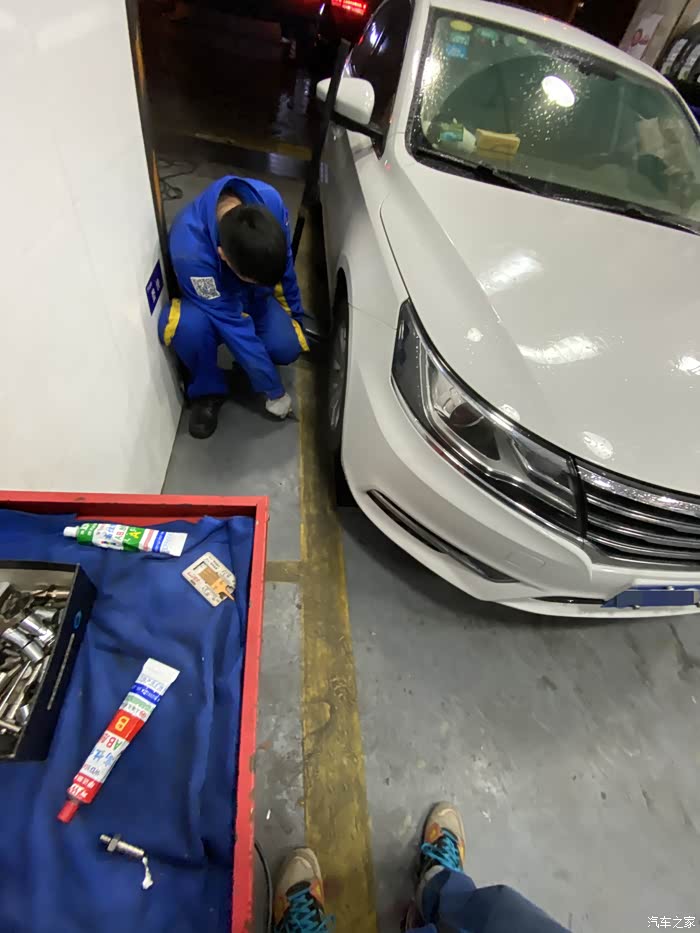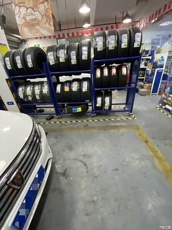 荣威小6从来也没有出过什么问题,突然早晨上班途中跳出胎压报警,因为还两公里就到公司了,就没下车查看,到公司停车场,立即查看轮胎状态,发现右前轮胎明显偏软,准备下班后前去维修。下班天已经黑了,看起来车胎里气还是听多了,除了踢上去稍微软一点,应该能撑到修车点。如果是完全没气了,就需要更换备胎再行驶了,否则一是不安全,二是完全没气的情况下行驶会伤汽车轮毂,而且原本的塑胶轮胎也不能再用了。最终百度导航去了最近的一家车享家,小师傅一眼看出了车胎有问题,立马拆下轮胎查看情况。