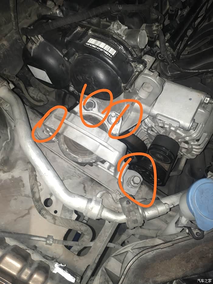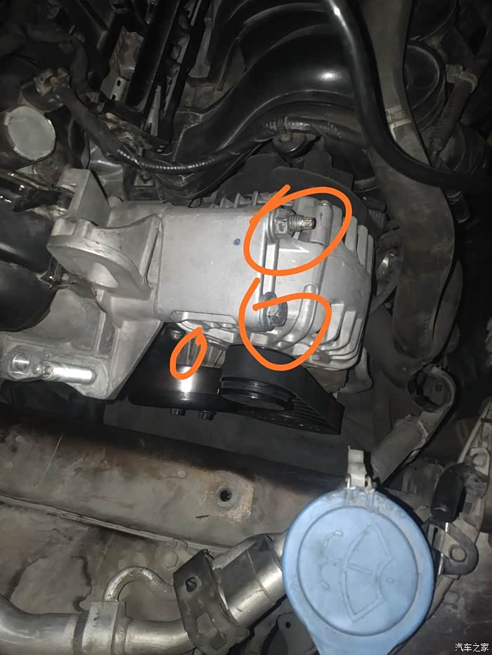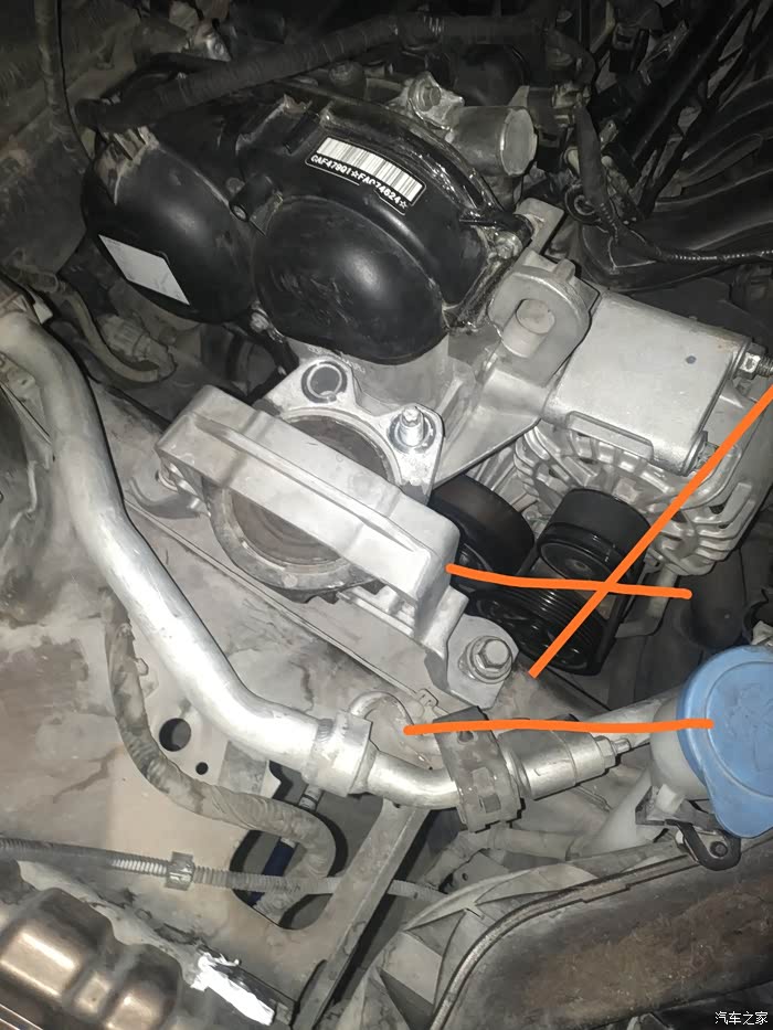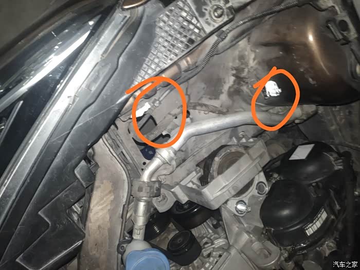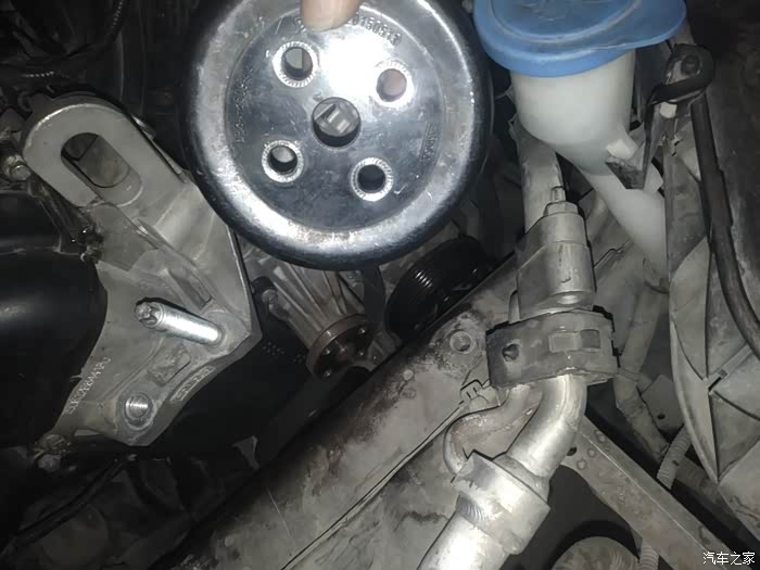 皮带型号4S的车友建议我先断电源负极再维修,不知道有没有根据。我第一次没有断电,第二次断电了。 1/拆水壶,水壶就是通过这两个卡位卡住的,往上提就可以。拆掉固定的水管卡位,把水壶移到合适的位置放好。小心有根细的水管很容易折断。