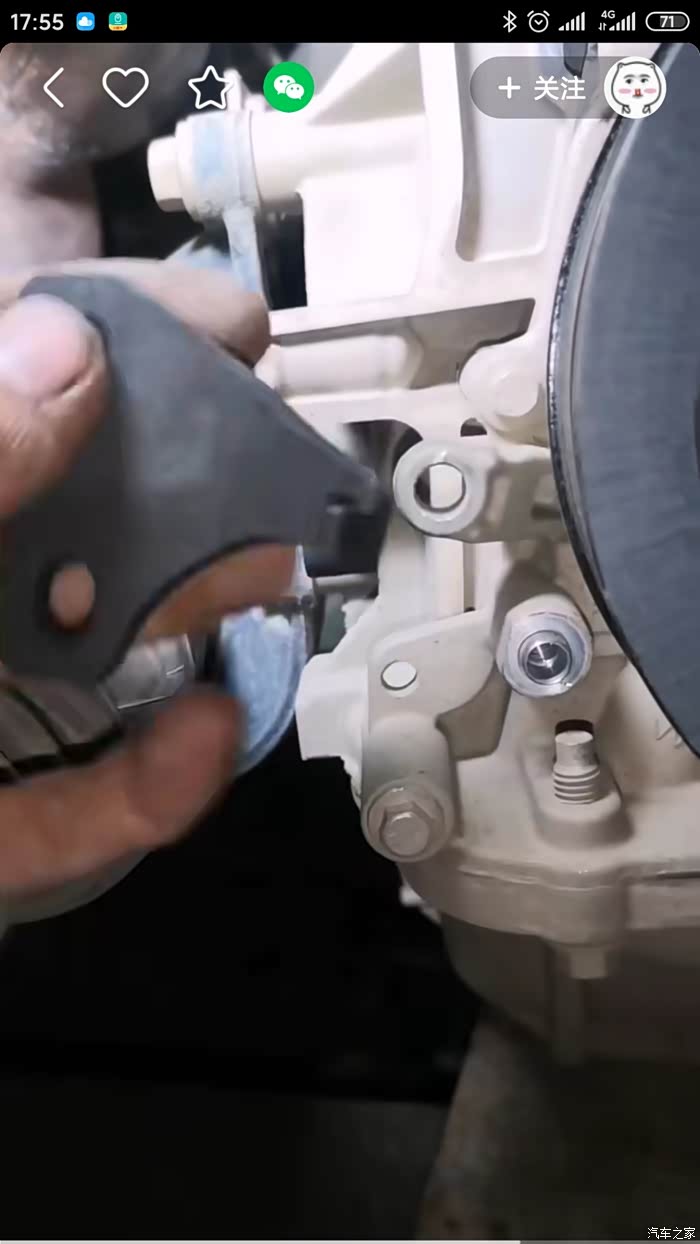 10/拆起动机工具卡死(启动机就在机油滤芯边上,拆掉三颗螺丝就可以取下来,取下来以后可以将它别到一边去,可以参考我之前的帖子,)~由于工具螺丝不能上紧~用顶着以免拆是跑位,确定卡住飞轮