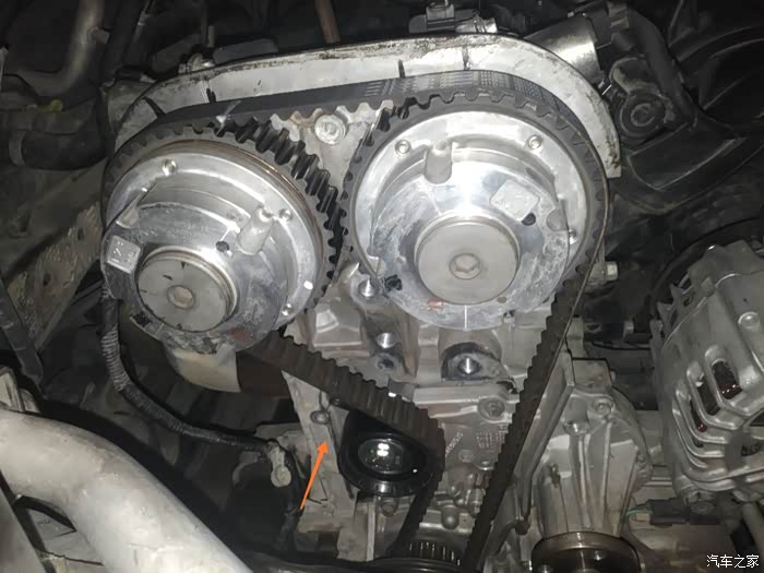 17/新的涨紧轮带插销固定住的,装上皮带以后,装皮带的时候最好是往左边稍用力带,并且上面的皮带齿一定要卡到位,放掉涨紧轮。