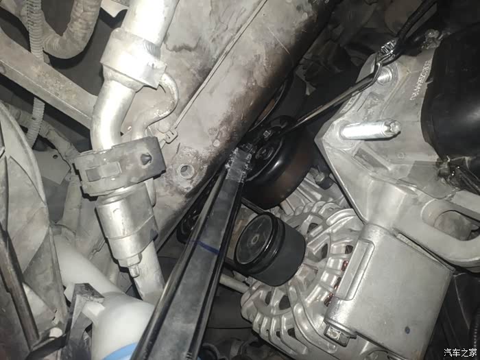 取掉上面两颗螺丝并且把它拿下来。然后再松动一下,下面一颗固定螺丝。就可以从发电机往外搬一带就松掉了。取掉发电机皮带。