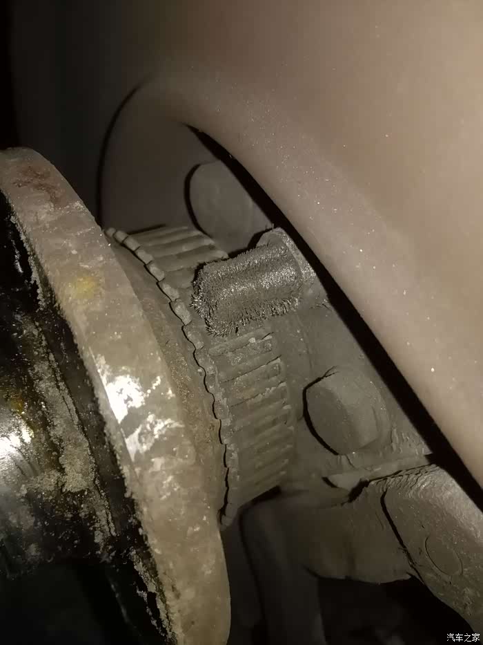 刹车盘拆除后,盖板后的真身,原来我以为后面会有一大堆弹簧和小型鼓式刹车机构。让我失望的是啥也没有,只有速度感应器伸进来的探头,脏兮兮的,齿轮咬合位置一堆铁屑,清理不掉。