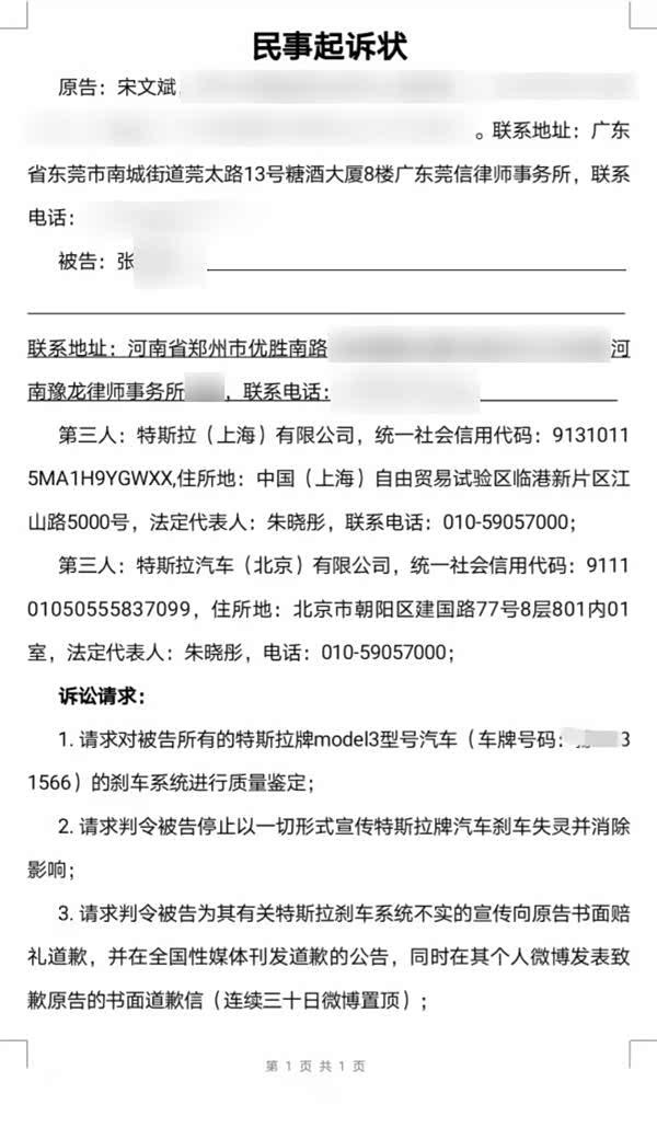据了解,宋车主在《民事起诉状》中称,自从女车主以特斯拉“刹车失灵”开始维权后·,社会上越来越多人被误导,将“特斯拉”和“刹车失灵”联系在一起,并因此对其他特斯拉车主进行善意或恶意地问候、讥讽、嘲笑甚至人身攻击。