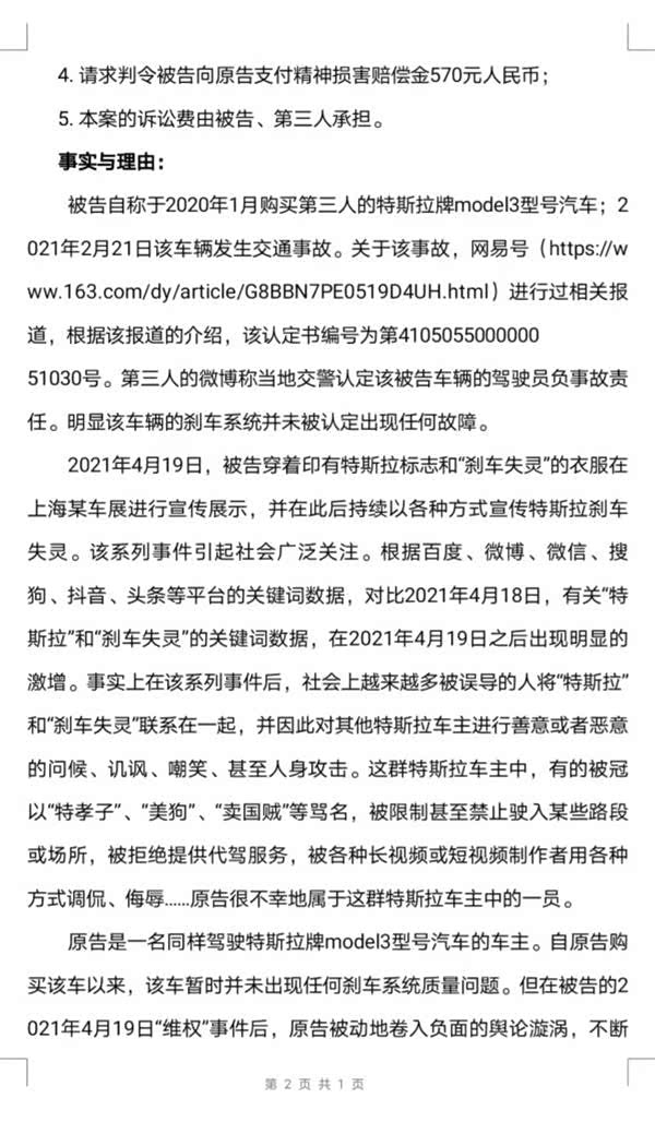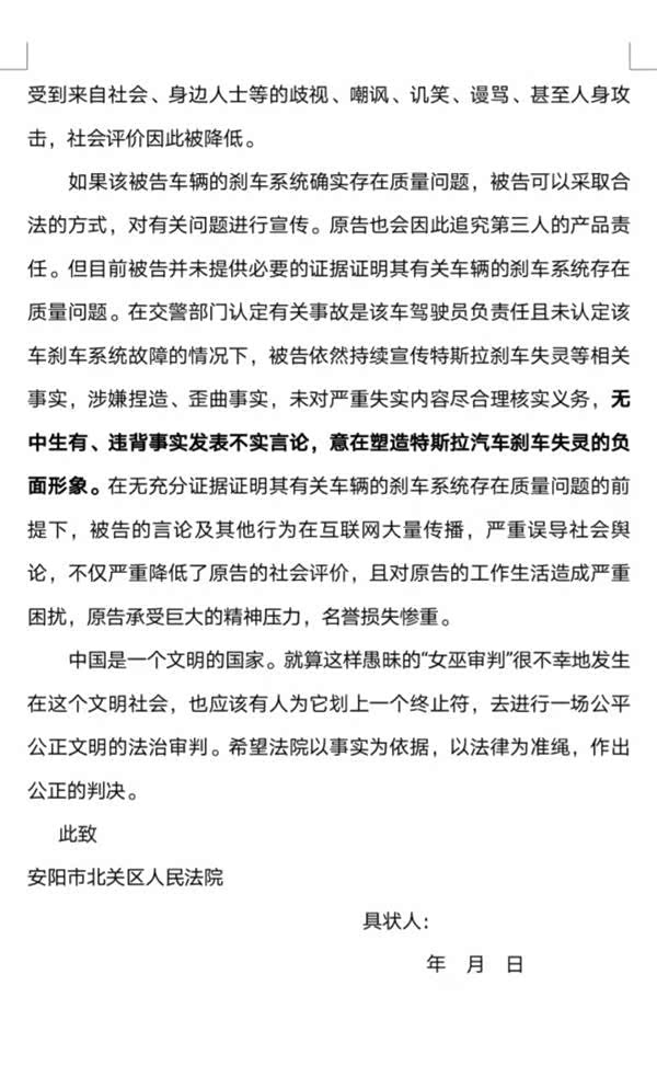 “原告很不幸地属于这群特斯拉车主中的一员。”宋车主在《民事起诉状》中称,他也驾驶特斯拉,他的车没有出现过任何刹车系统质量问题,但在女车主维权事件后,他“被动地卷入负面的舆论漩涡,不断受到来自社会、身边人的歧视、嘲讽、讥笑、谩骂甚至人身攻击”。如果特斯拉车辆刹车有问题,女车主可以采取合法方式,对有关问题宣传。但目前,女车主并为提交证据,证明车辆问题。同时,女车主在交警部门认定为全责,并且未有刹车系统故障的情况下,依然持续宣传特斯拉“刹车失灵”等,塑造特斯拉的负面形象。