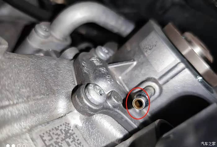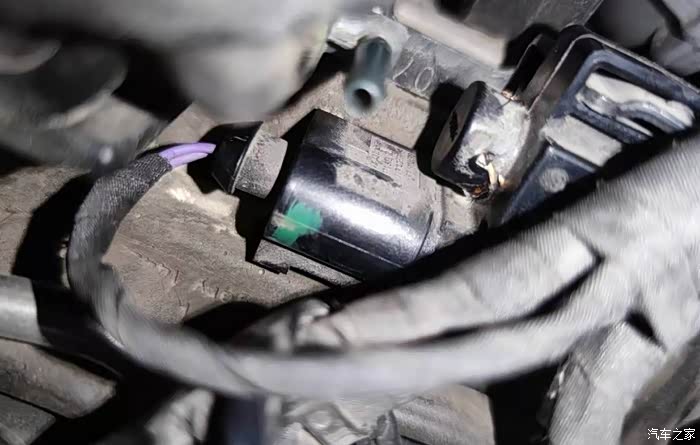11、顺着真空管路往上找,发现机械式水泵切换阀外部有冷却液痕迹,此阀是由发动机电脑进行控制,从而进一步控制水泵内部冷却液循环,因有冷却液进入,导致此阀机械卡死,只是冷却泵不进行工作;