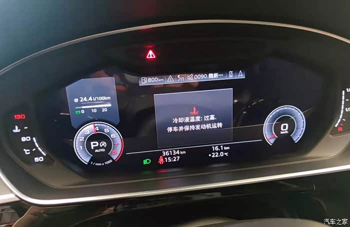 2、根据客户反映情况进行试车,原地加油门试车,5分钟后仪表显示冷却液温度过高,请关闭发动机,电子扇高速运转;