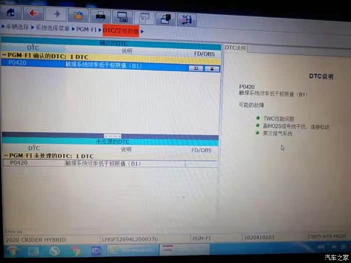 2.用诊断电脑读取DTC ,故障代码为P0420-触媒系统效率低于极限值(B1),单一故障代码,如下图: