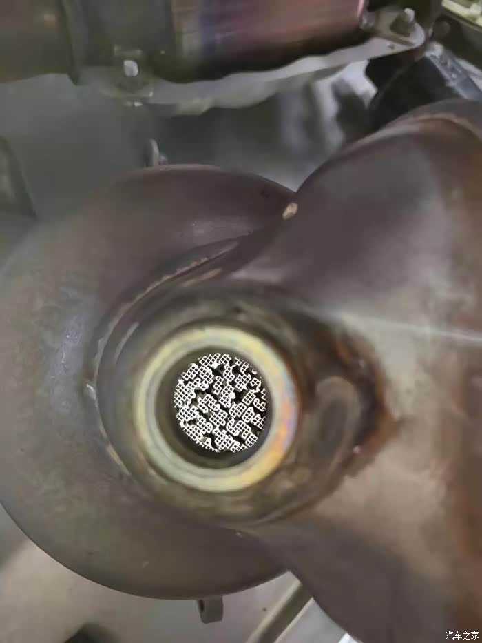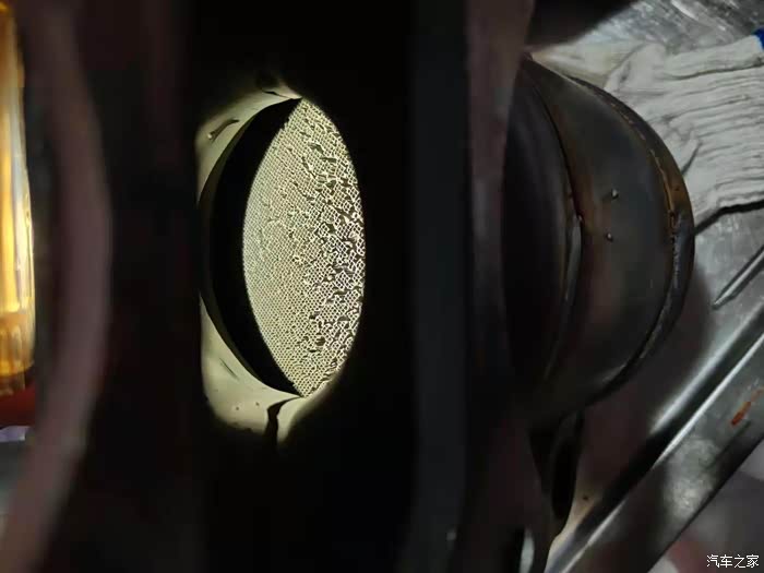 对照数据列表分析:发动机转速正常,氧传感器工作正常,但数据有些偏差,未发现明显缺火异常,拆下火花塞检查,火花塞电极间隙正常,表面有积碳,拆下燃油泵检查燃油状况,油质颜色上无明显变化,气味有些不同,但不刺鼻,怀疑汽油品质有不良,询问客户大部分在中石化加注92#燃油,考虑为新车,拆除S1氧传感器,使用内窥镜检查,发现问题,三元催化器进气侧表面裂化严重,如下图: