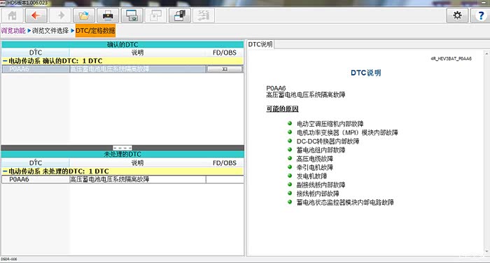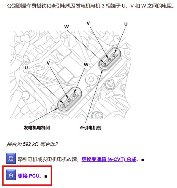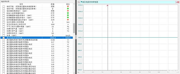 再次关闭点火开关,断开电瓶负极,做好高压防护,断开PCU电缆,用电工胶布对插接器做好绝缘包扎,打开点火开关,高压电路的绝缘电阻立即恢复1000千欧,到此怀疑故障可能在PCU和牵引力电机或发电机。拆卸PCU利用兆欧表测量电动机、发电机段子,绝缘阻值1000兆欧正常。可以确定是PCU的问题,保险期间替换一台试驾车上的PCU,替换安装学习完成后,试车故障依旧。此时查看数据流发现高压电路绝缘电阻又在100千欧姆左右波动