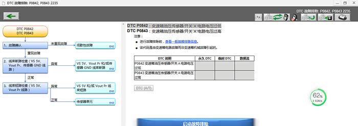 3.根据电子维修手册,对DTC P0842:变速箱油压传感器/开关“A”电路电压过低,进行维修过程诊断
