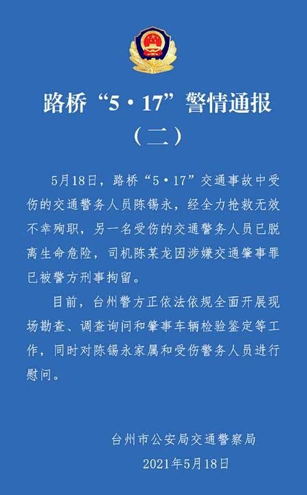 浙江台州市公安局交通警察局通报,5月18日,路桥“5·17”交通事故中遭特斯拉撞击的两名交警,其中一人因抢救无效离世。