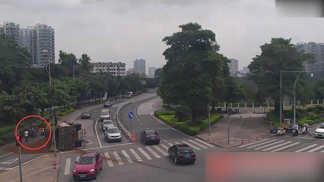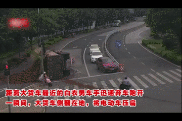 就在那么一瞬间,满载沙土的大货车发生侧翻,被白衣男车手丢弃的电动车直接被压扁。瞬间倒地的大货车,车上装载的沙土撒了一地。