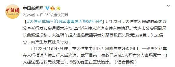 大连市公安局副局长曲波通报称,大连轿车撞人逃逸案肇事者刘某因投资失败无法接受,失去信心,而产生报复社会行为。
