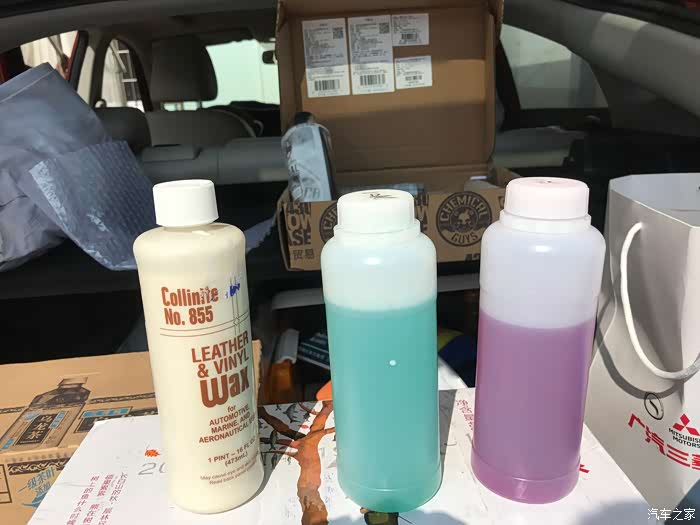 红色液体是柏油清洗剂,可以去除车漆上沾有的树脂、鸟屎等