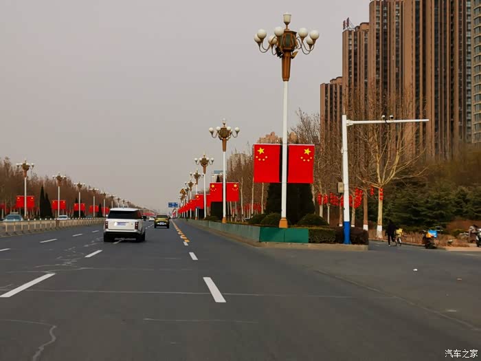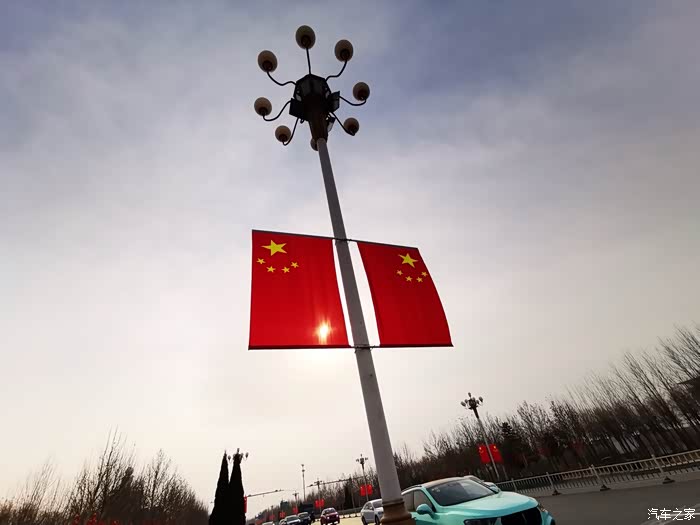 走在路上,被两侧的路灯吸引住了。两侧的国旗,已经高高的挂起来了。