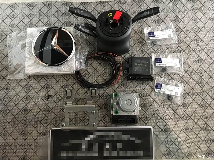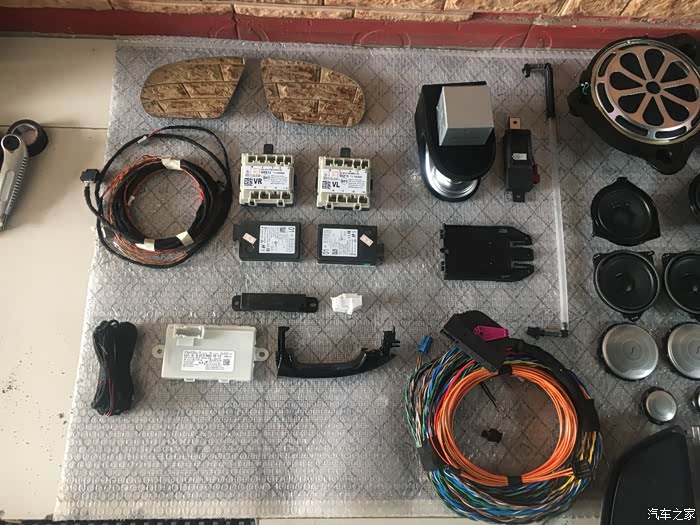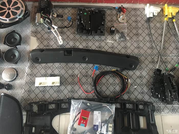 以下是拍的一些配件图片,拍完就走了,我也没看,细节图没拍到,大家先凑合着看吧。改的项目大概有电吸门、电尾门、脚扫、无钥匙进入、ACC、柏林之声、香氛负离子。