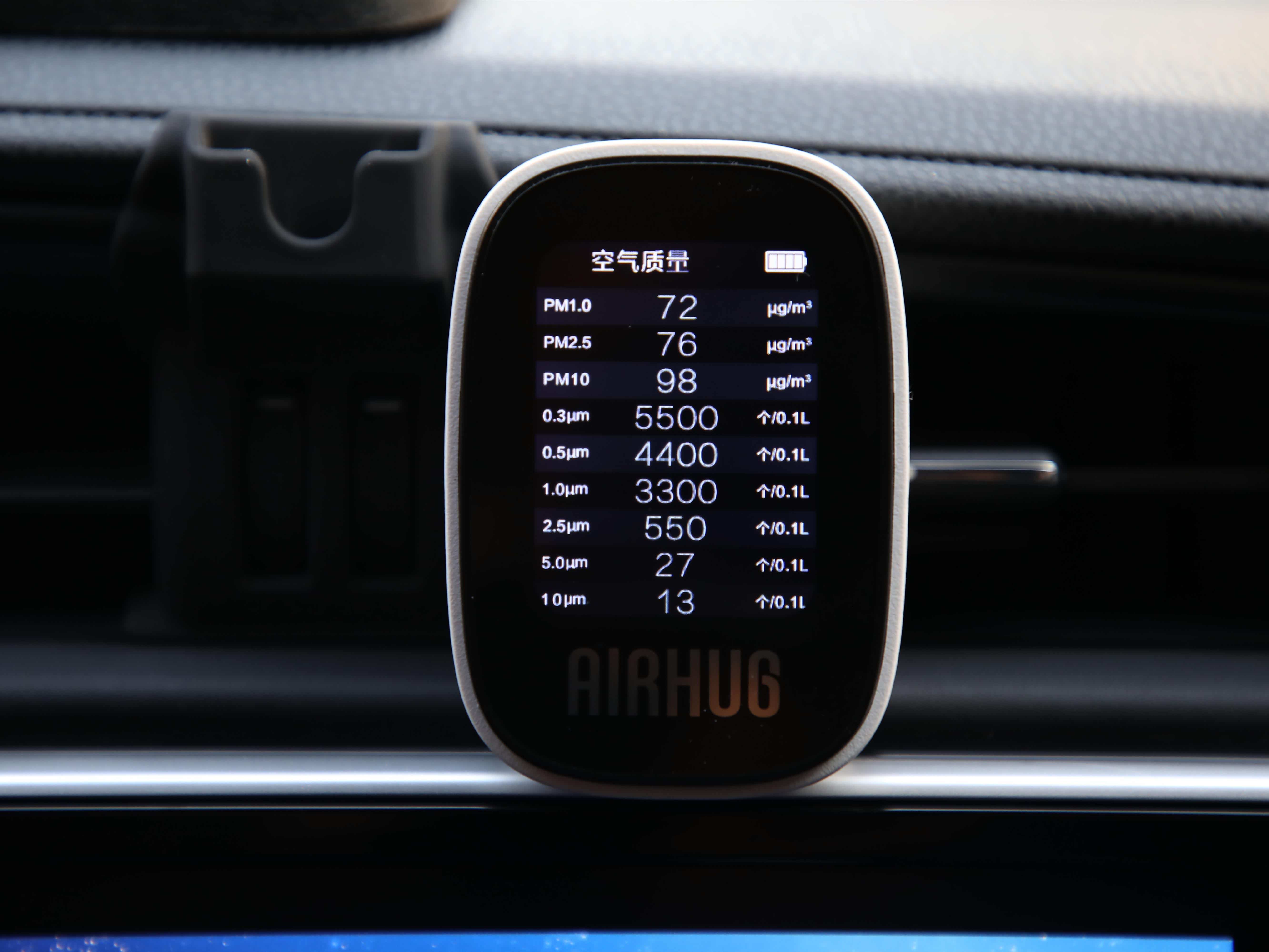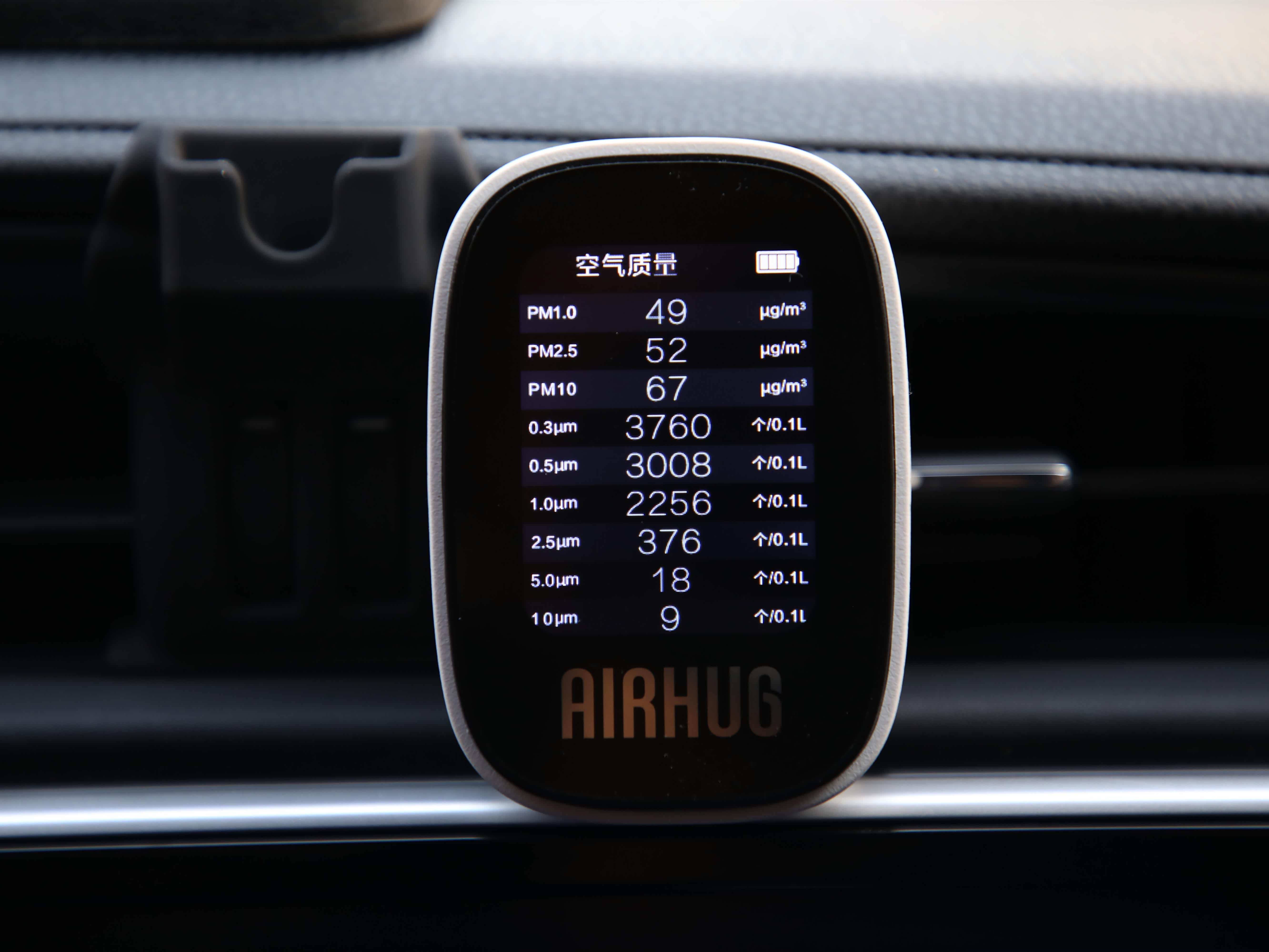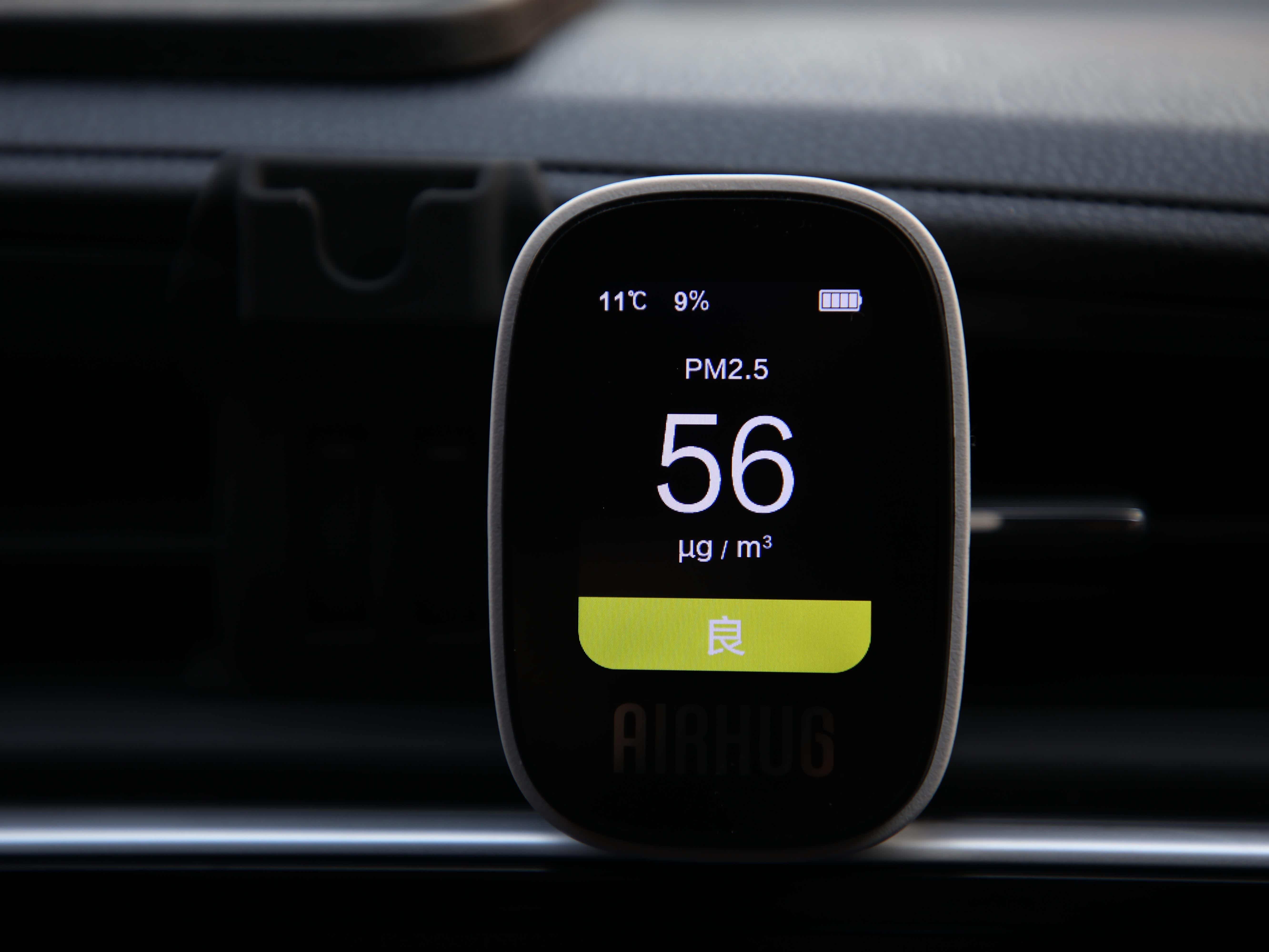 将空气质量检测装置卡在空调出风口上就可以进行测试了。刚上车目前车内的空气还算不错,但是到底好不好我们必须要开启空调才行,让空气流动起来。