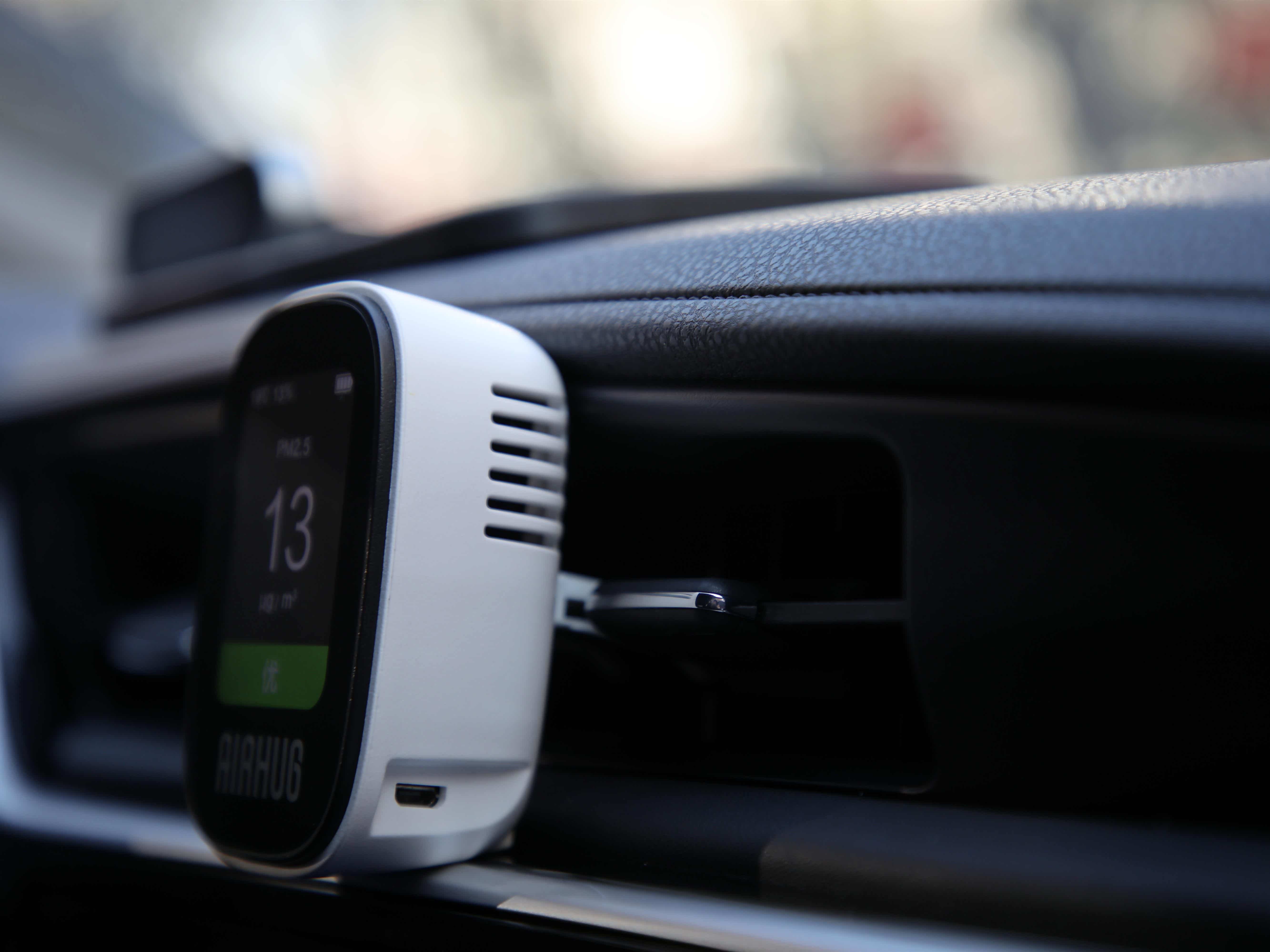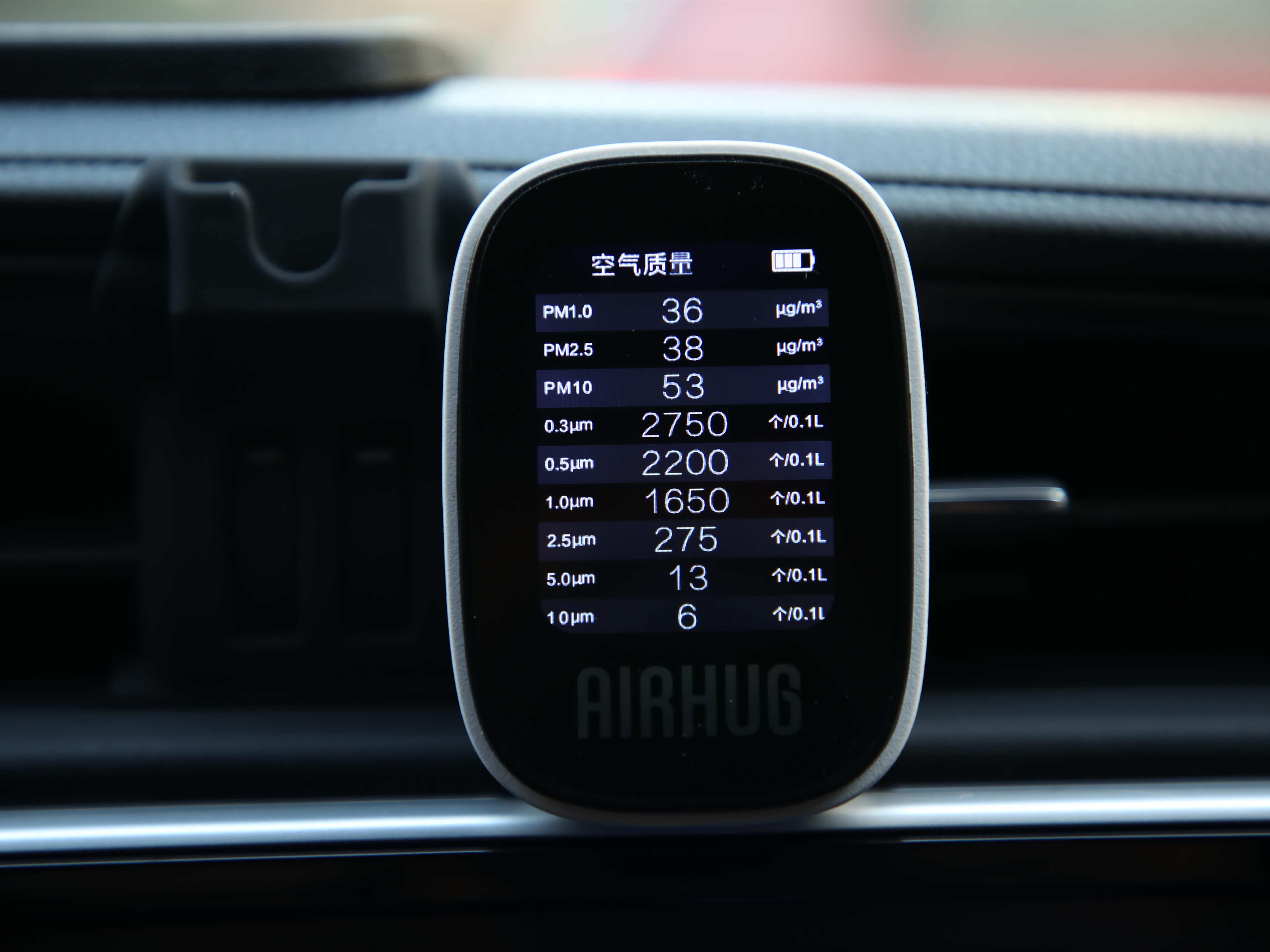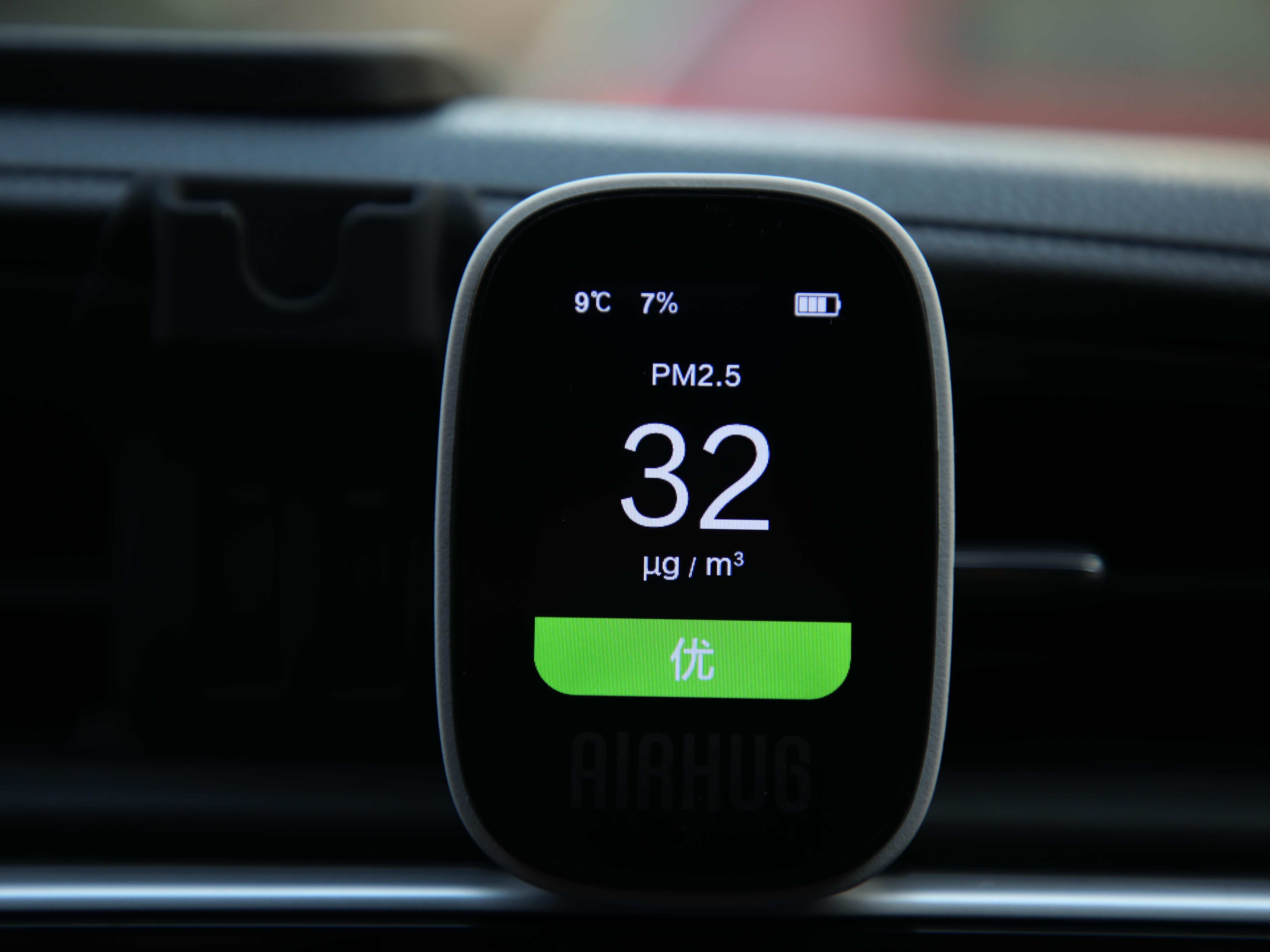 将空气质量检测装置卡在空调出风口上就可以进行测试了。刚上车目前车内的空气还算不错,但是到底好不好我们必须要开启空调才行,让空气流动起来。