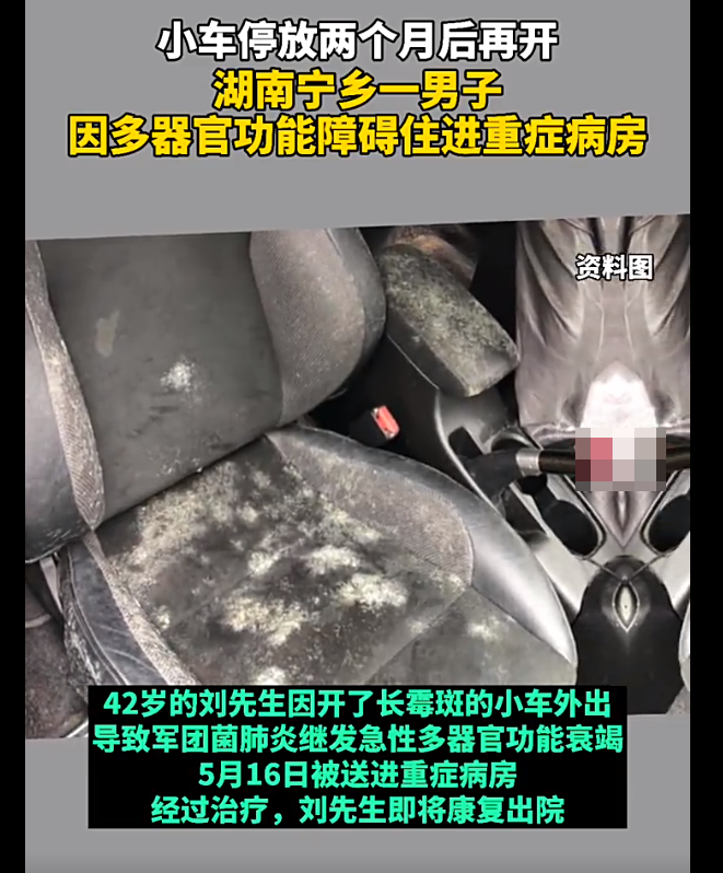 42岁的刘先生家住宁乡市,因为近来雨水不断外出不便,家中的小车停放了近两个月没有动,车内都长出了霉斑。趁着天气放晴、气温回升,便开车回了一趟乡下老家。没想到2天后,刘先生出现肌肉疼痛、头痛、寒战、胸痛、咳嗽等症状。自以为是感冒,吃了感冒药仍不见好转,还发起了高烧、呼吸困难。随即到当地医院就诊,竟被告知肺、肝、肾等多器官功能障碍,病情十分危重。