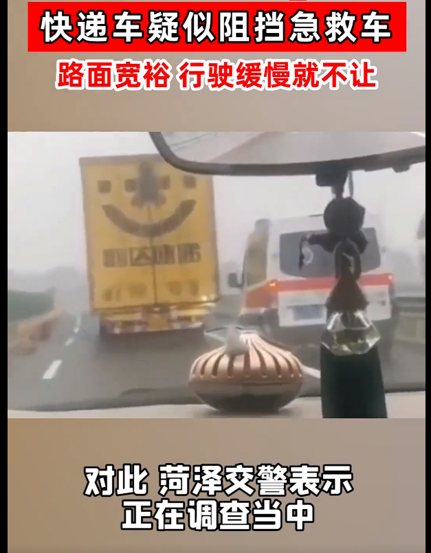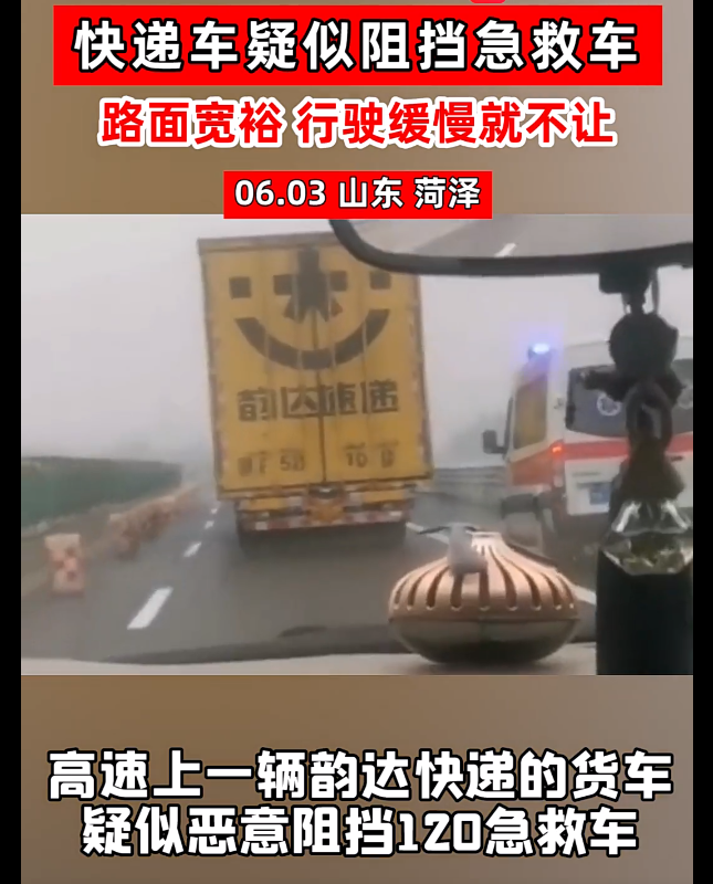 六月三日,山东菏泽的一位车主曝光了一辆韵达快递员在高速行驶中故意挡住出勤的120救护车。