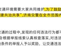 为了应对部分驾驶员在行车过程中随意变道等不遵守交通法规的现象,济南交警在2018年11月实行了”交通违法随手拍“的活动。市民可以参与活动,将违法信息牌照上传到平台,交警部门会根据线索进行核实。如果确实无误将会对举报人员给予一定的奖励,从而让交通违法行为无所遁形。该活动根据违法活动的严重程度不同,会给予举报人低到十元,高到二三百百元的奖励。