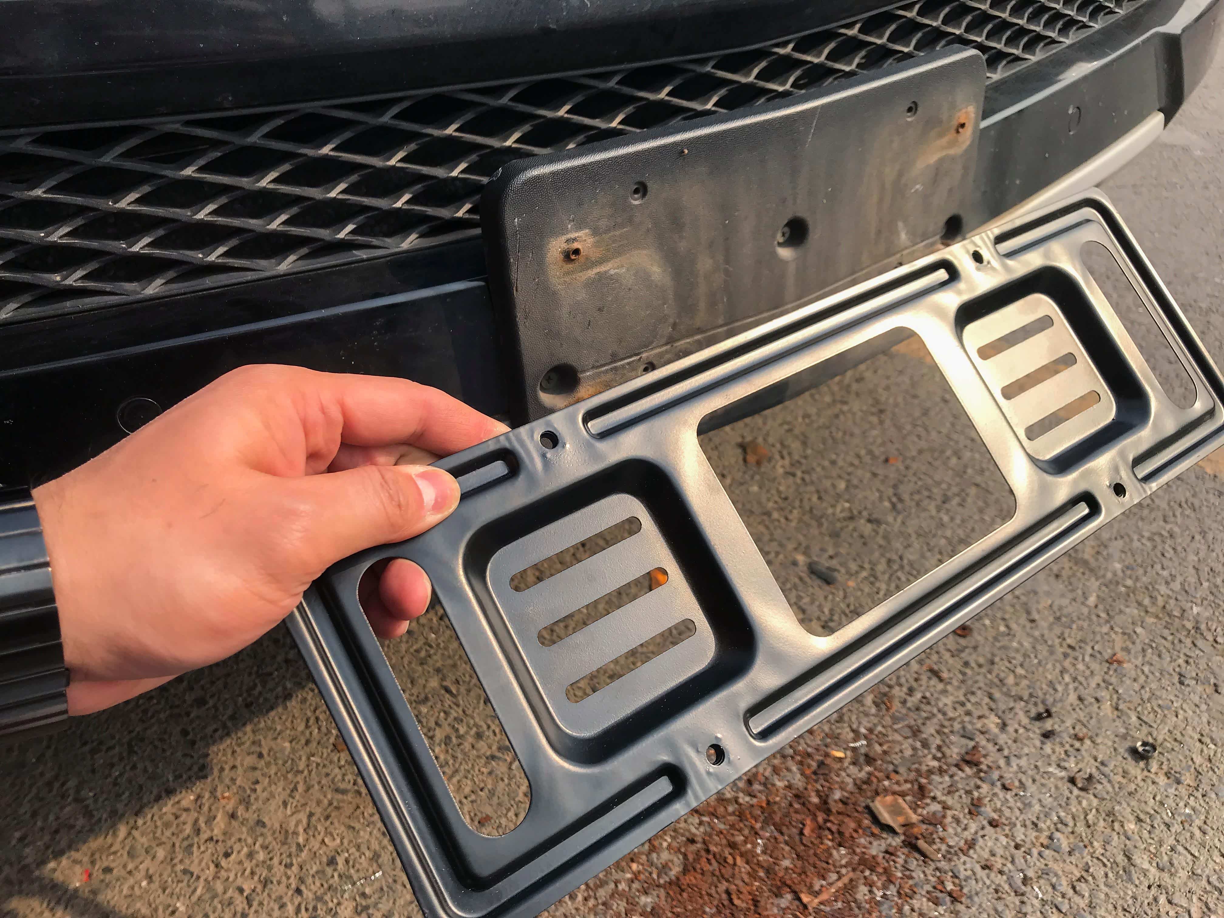 购买一个新的牌照托换上去,铁制的直接拧上去就可以了。