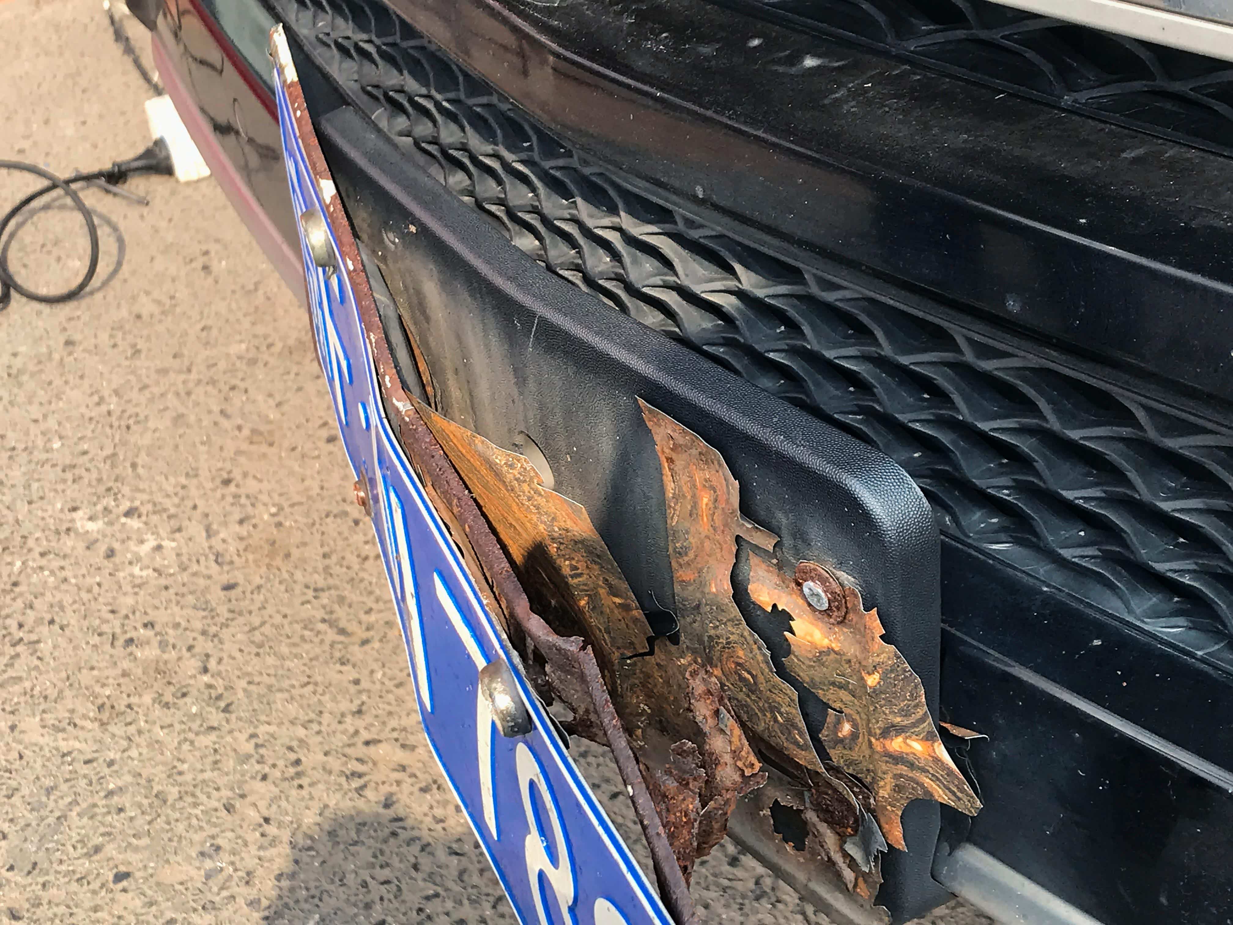 在上线检测的时候工作人员提出一个两个问题,首先是前车牌牌照螺丝不合格,需要更换,但是本车型为美规车,必须要用牌照板转换螺丝位置,原车的已经锈死,拆装很费时间,只能是破坏性拆解了,反正那个底座也不用留着了。