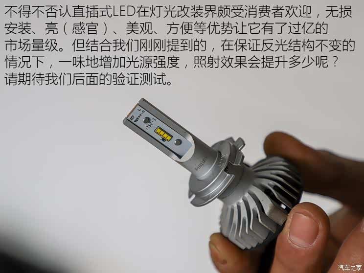 从最远照射距离、30米照射强度、远光最远照射距离与远光照射强度这个四组数据对比现场的LED大灯车型完全是碾压。这样的结果令我们很惊讶,一边是令人不屑卤素+灯碗,一边是当下流行的LED+透镜,怎么就被碾压了呢。其实这根光源与反光结构的关系密不可分。这也恰恰说明了,光源强度只是改灯的一方面,一个与光源构成有效反射的反光结构同样很重要。所以,这样引出我们下一个话题——直插式LED
