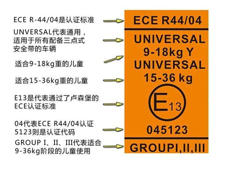 购买国内的儿童座椅首先要看两个认证,一个是3C认证即国家强制性产品认证,一个是ECER-44/04认证,当然只看ECE认证还不算完,这篇文章中有关于该认证的详细介绍《购买时需认清!解析儿童安全座椅认证》各位可以查看。简单来说,ECER-44/04认证后面都会带有一个字母加数字的组合,如E1、E4等,它们分别代表了不同国家的标准。