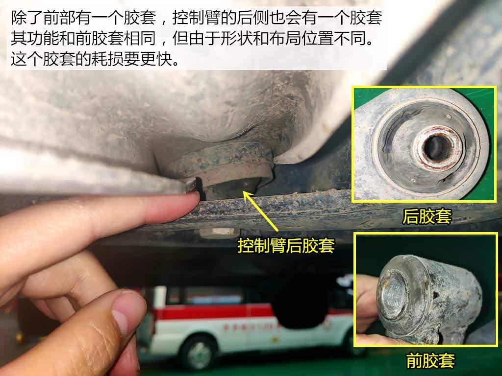 控制臂的另两个固定点为了降低行车中的震动,会采用胶套连接的方式。虽然胶套的出现会降低震动,提升驾驶质感。但胶套老化开裂也同样会导致控制臂出现间隙。所以我们要定期检查固定螺栓是否松动。