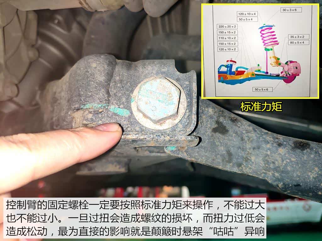对于底盘零件的固定螺栓扭紧力矩,我们必须要遵从标准。不能过扭也不能少扭。过扭会导致螺纹的损伤,修复起来会相当麻烦。而少扭则会带来控制臂松动,产生颠簸异响。
