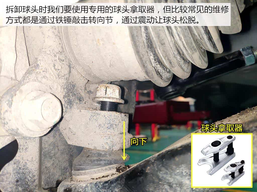 可以看出球头内柱采用了梯形角度的设计,安装后通过螺栓的紧固,球头与转向角安装孔会连接的非常紧密。就算我们拆下固定螺母,也不能取下。很多修理工为了省事会使用铁锤敲击转向节的方式将球头振下来,但这种做法非常错误,不仅会对转向节造成损坏,一旦失手将会把球头防尘套打破。所以在拆卸时我们要使用专用的球头拿取器。