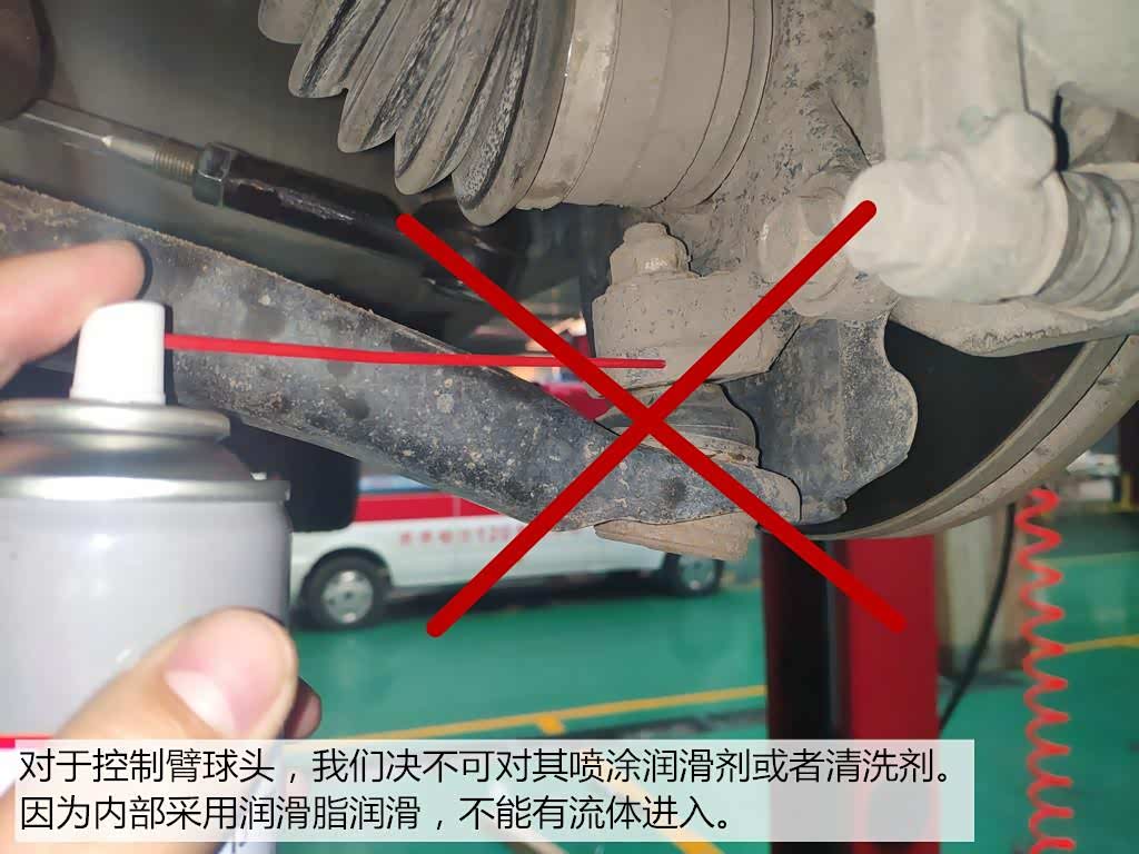 但对于控制臂球头,是坚决不能喷涂液体润滑剂的。因为润滑剂内部都带有除锈功能,对于球头内部的润滑脂会造成稀释。从而降低润滑脂的润滑能力。除了控制臂球头,其他球头也都不能喷涂润滑剂。