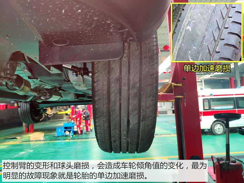 前悬架的倾角变化,最为直接的影响就是轮胎会出现异常磨损的现象。倾斜角度的不同可分为轮胎内侧加速磨损或外侧加速磨损。