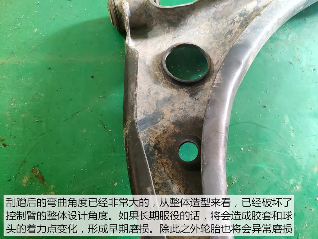 而由于控制臂位于悬架的最下方,所以刮蹭的几率也是最大的。该车的控制臂就经历过刮蹭,以至于产生了比较明显的变形情况。这种变形虽然短期内不会对安全造成什么影响。但会改变球头和胶套的受力点,从而加速损坏。所以在控制臂出现刮蹭变形以后,我们要尽快更换。