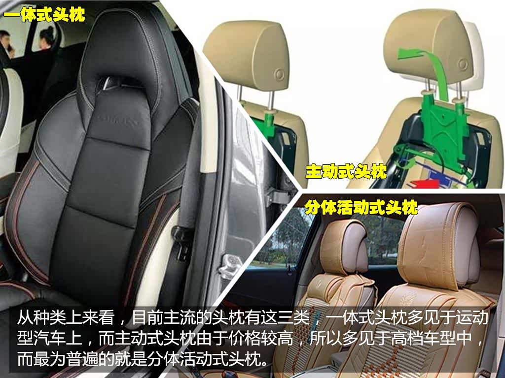 2、主动式头枕:受制于制造成本高的问题,多见于豪华车型上,其头枕有一套主动的伸缩设备,在收到撞击的时候,头枕会主动向前移动,给予头部更好更及时的支撑。