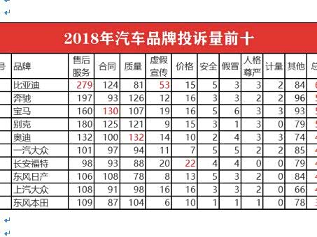 日前,中国消费者协会发布了“2018年全国消协组织受理汽车产品投诉情况分析报告”,统计了过去一年国内市场各大品牌车企投诉情况。从投诉排行中显示,自主品牌比亚迪是全年投诉量最大、售后服务最差的品牌,豪华品牌奔驰、宝马、奥迪投诉量位列至前五名。