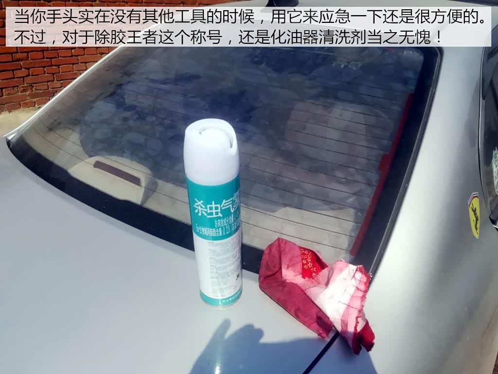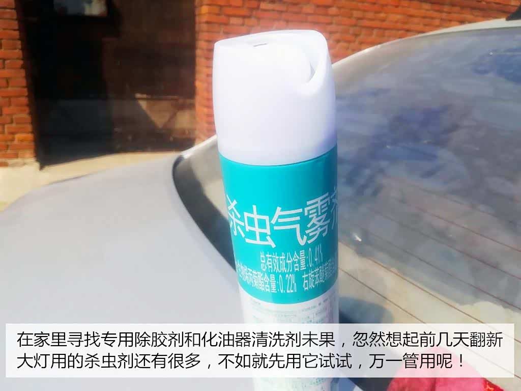 实在没办法,我只能把目光重新聚集在了我前两天用来翻新大灯的杀虫剂上面。我寻思着,这玩意又能杀虫,又能翻新大灯的,除个胶应该也是不在话下的吧?